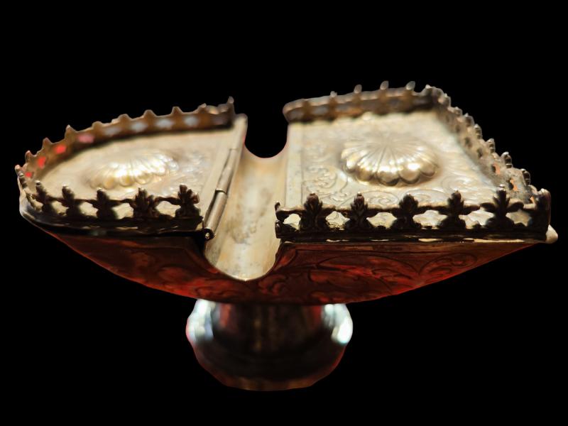 Sencilla naveta de estilo barroco elaborado con plata en su color. Proa y popa van separadas por una profunda escotadura. La tapa, en la proa, es abatible. Conserva remate a modo de crestería calada