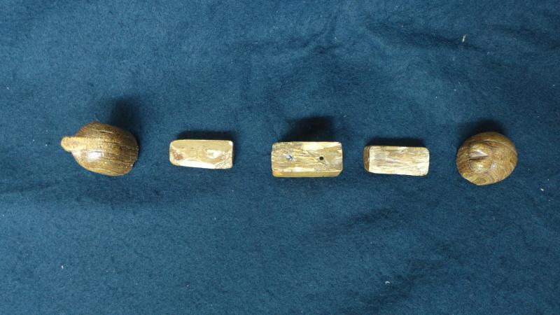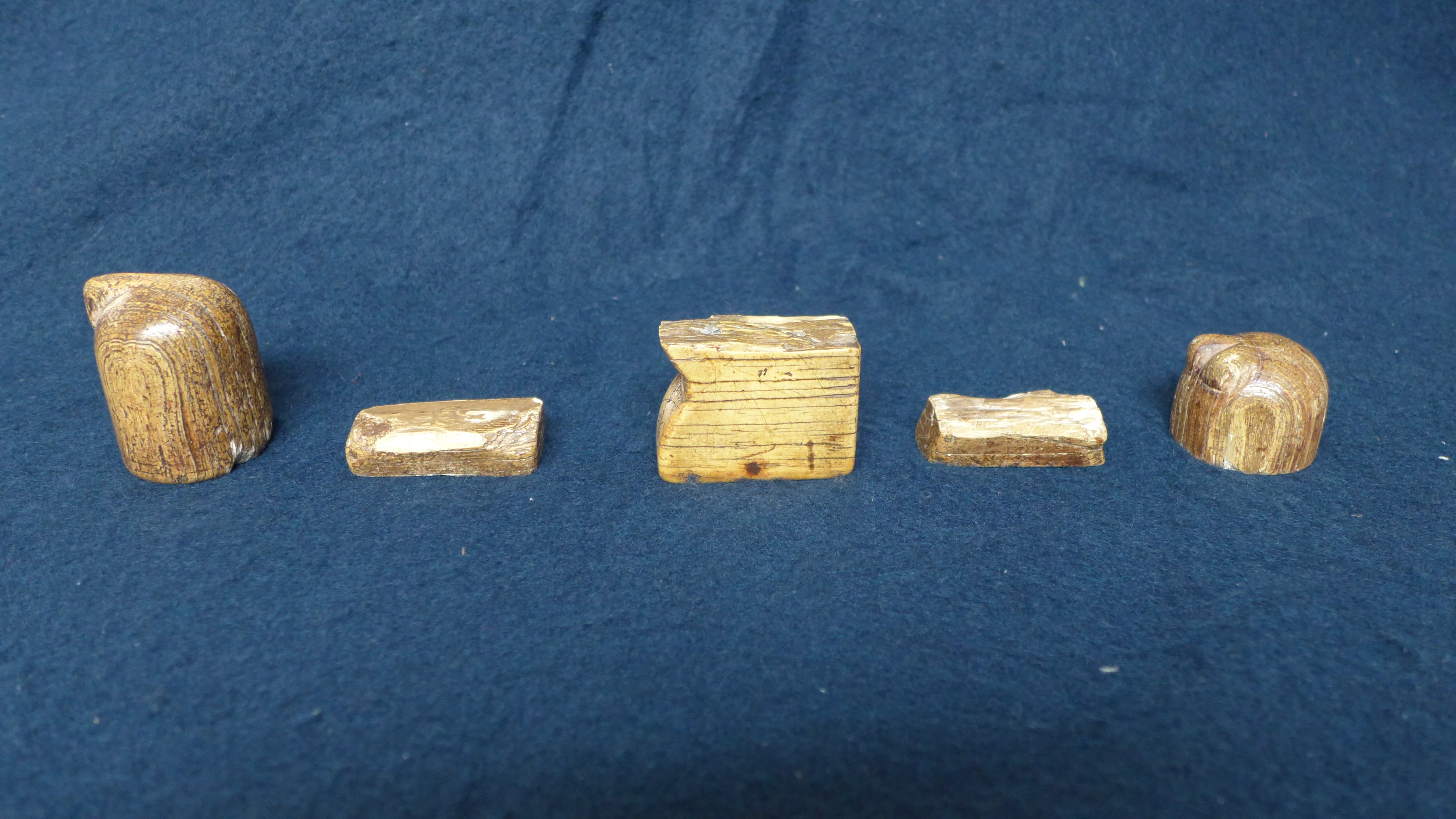 Conjunto de piezas de ajedrez realizadas en marfil y que han sido atribuidas a las posesiones del obispo-abad. Son cuatro ejemplares, dos de ellos completos y los dos restantes fragmentarios. Las dos piezas completas son un alfil, decorado con incisiones laterales, y un peón tallado en su zona superior, ambos de sección cilíndrica. En cuanto a las dos piezas incompletas, en ambos casos se trata de torres, con su característica forma prismática y decoración simétrica truncada en su centro superior. La torre mejor conservada ha perdido un fragmento lateral, mientras de la otra sólo nos ha llegado la mitad. En la primera son visibles las triples incisiones verticales que recorren la zona central de sus frentes y la decoración por medio de círculos en su zona superior. Podrá compararse con otros conjuntos conservados en Celanova, Áger y San Millán de la Cogolla.