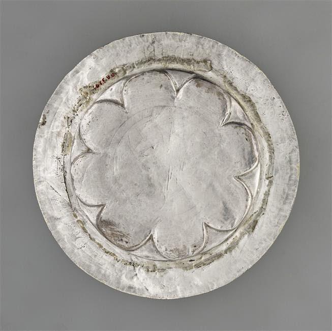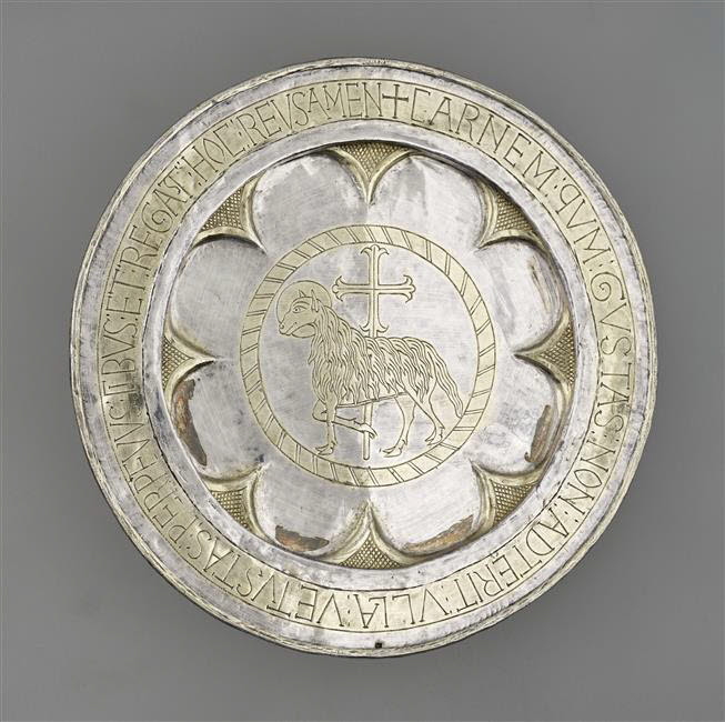 También conocidos como Cáliz y patena del abad Pelayo, se trata de una de las joyas más preciadas de la orfebrería románica hispana. Como la anterior pieza, la patena responde a un modelo consagrado y muy utilizado en estos momentos. De forma circular se divide en dos niveles, uno interior más bajo, en el que el cordero nimbado que sostiene la cruz aparece en el centro de una superficie enmarcada por ocho lóbulos o gallones, relaciones con las particiones rituales del pan marcadas en la liturgia. El exterior, plano, lo recorre de nuevo una inscripción eucarística dentro de una banda dorada. En un momento indeterminado del siglo XIX un responsable de la diócesis de Astorga los regaló al Cardenal Moreno, arzobispo de Valladolid y de Toledo, y a su muerte los herederos vendieron ambas piezas a un anticuario, quien en 1886 las revendió mediante subasta pública al Museo del Louvre.