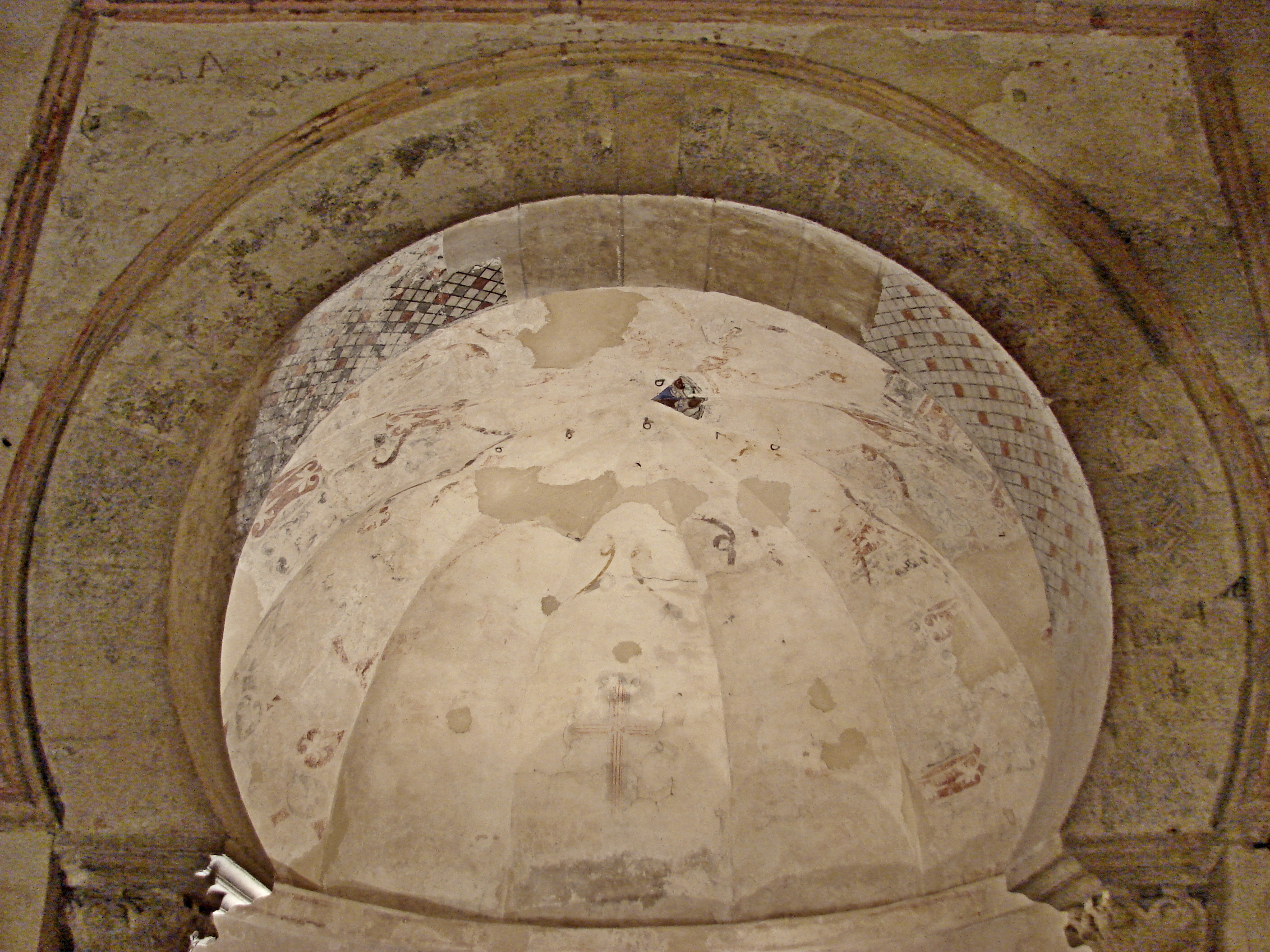 Restos de pinturas murales de la bóveda gallonada absidal, con superposiciones postmedievales.