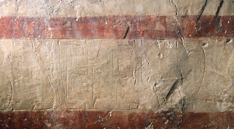 Inscripción de consagración incisa en la línea de imposta absidal. Está escrita en capitales romanas de doble línea, con escritura visigótico-mozárabe. Transcurren las letras, de unos 8 cm de altura, entre dos líneas-guía remarcadas con color rojizo