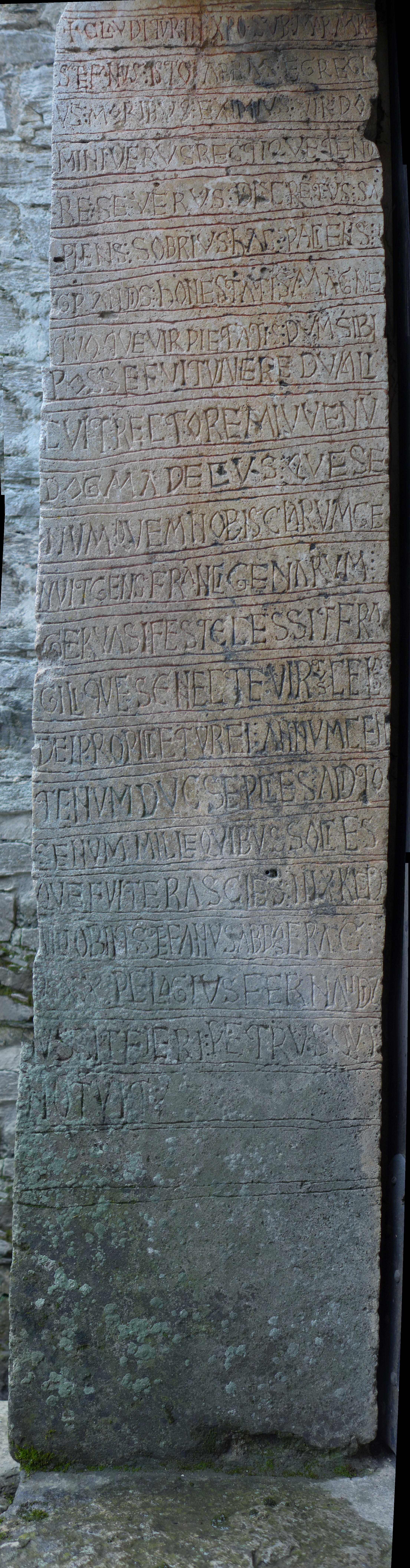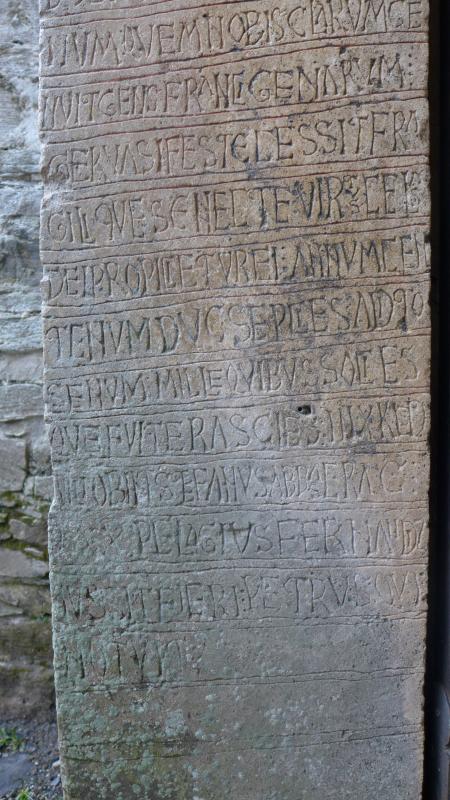 lo que viene a significar: "Bajo este mármol, sepultado en Cristo, está Esteban , abad insigne, de costumbres sin mancha, verdadero hombre del Señor, recto y severo en vida, discreto, sabio, sobrio y paciente, de gran honestidad y hombre de gran piedad mientras le fue posible, mientras estuvo vivo. La nación francesa nos dio un válido rector de jóvenes, modelo y guía de ancianos. Se rindió a la frágil vejez en la fiesta de Gervasio. La virtud de Dios le sea propicia. Si al año ciento añades siete veces diez y a estos unes mil, sabrás la era en que fue. El 19 de junio murió Esteban, era 70 (año 1132). Pelayo Fernández lo mandó hacer, Pedro fue el que lo escribió."