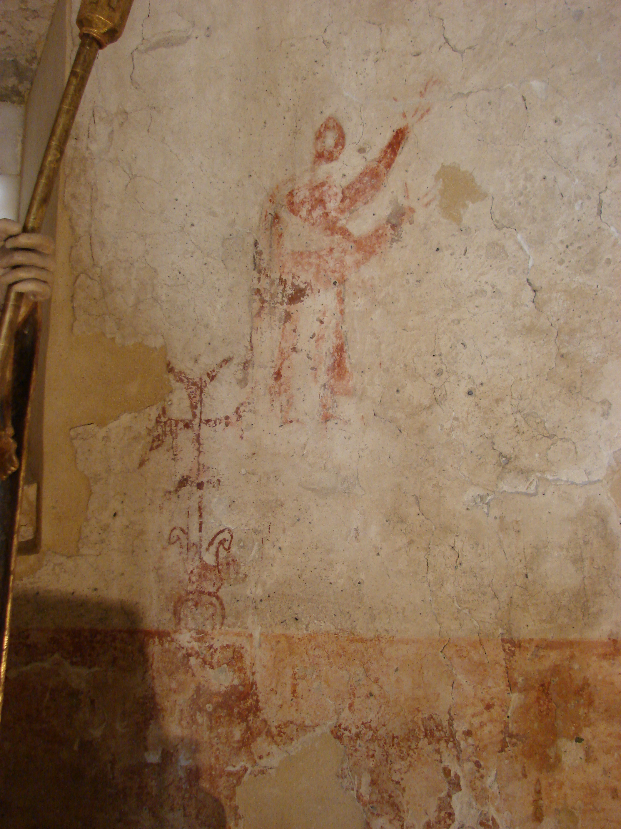 Grafitos pintados con almagre representando a un personaje mitrado y una cruz patada sobre vástago