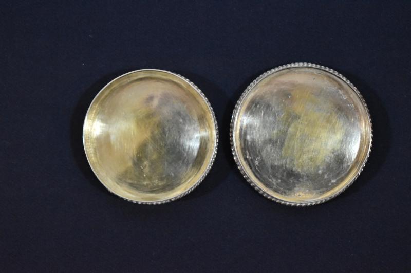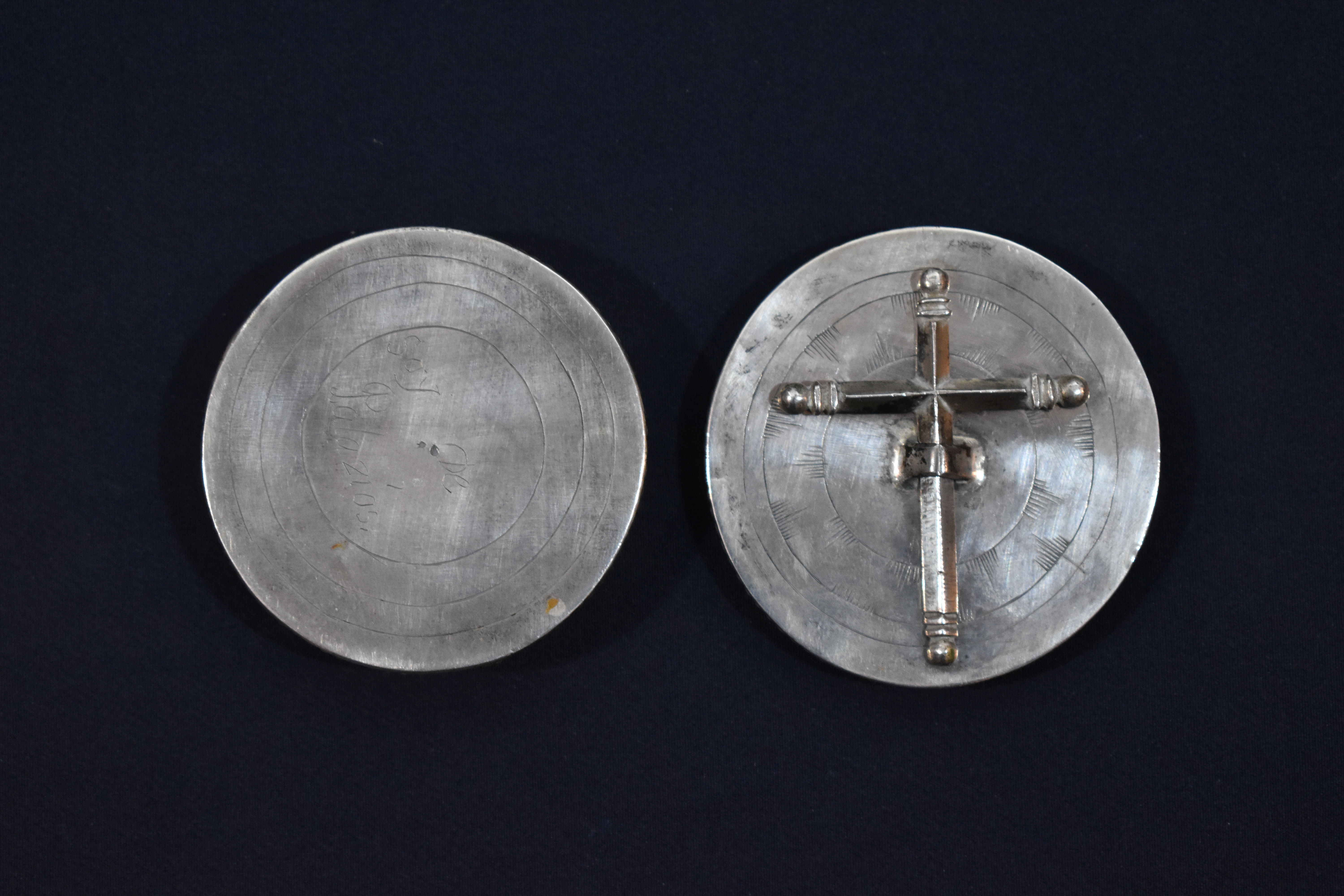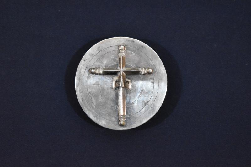 Caja circular y planta con borde ligeramente saliente y troquelado tanto en su tapa como en su recipiente. Una y otra parte se decoran exteriormente con tres círculos concéntricos grabados a buril, con la diferencia que en los de la tapa se incluyeron una suerte de incisiones a modo de resplandor. Sobre la tapadera se dispone una cruz de plata fundida, de travesaños diédricos y remates esféricos que se sujeta mediante una argolla plana que permite igualmente su extracción para ser utilizada durante la comunión. El interior va dorado.
