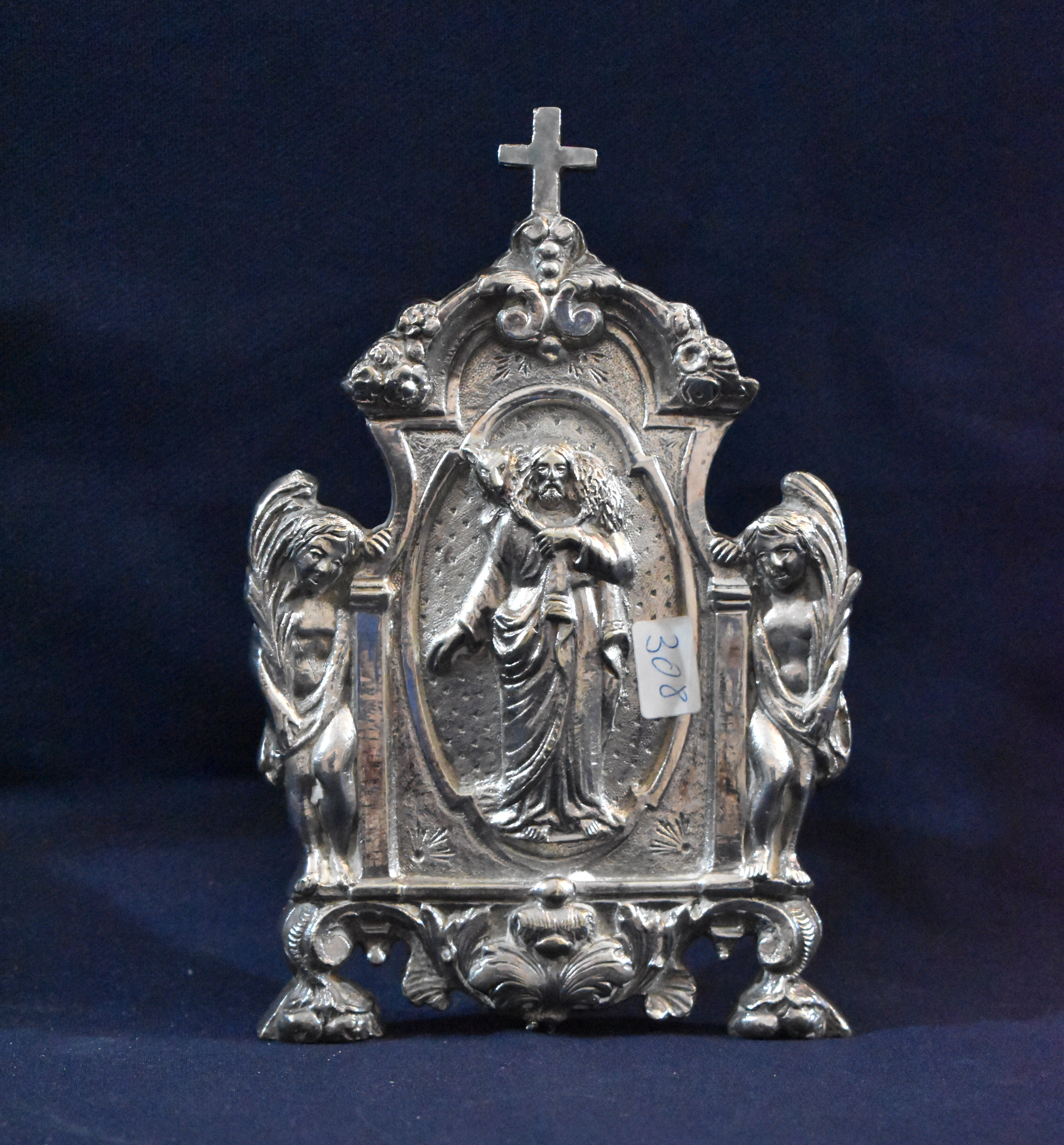 Portapaz neoclásico elaborado en plata y dedicado al Buen Pastor. Su estilo historicista se manifiesta no sólo en sus formas, sino también en el heterogéneo léxico empleado su decoración a base de elementos fitomorfos, niños con palmas y colgantes de flores. En el centro, dentro de una metalla circular la iamgen de Cristo con el agnus dei sobre los hombres. Todo ello fundido, al menos aparentemente, en una única pieza.