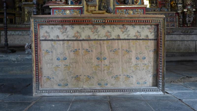 Frontal de lienzo, compuesto de dos retales cosidos de distintas telas, costuras ocultas por un galón que la dividen en dos espacios horizontales, siendo el inferior el que más espacio ocupa. Los tejidos se adornan con motivos florales grises y anaranjados en la tela superior y azules, amarillos y grises adamascados en la inferior. El frontal se conserva con su marco de madera, dorado y policromado en su frente en rojo (menos las esquinas y un tramo central de los largueros, en azul) y adornado por un contario continuo compuesto de pequeños tacos de madera semicirculares.