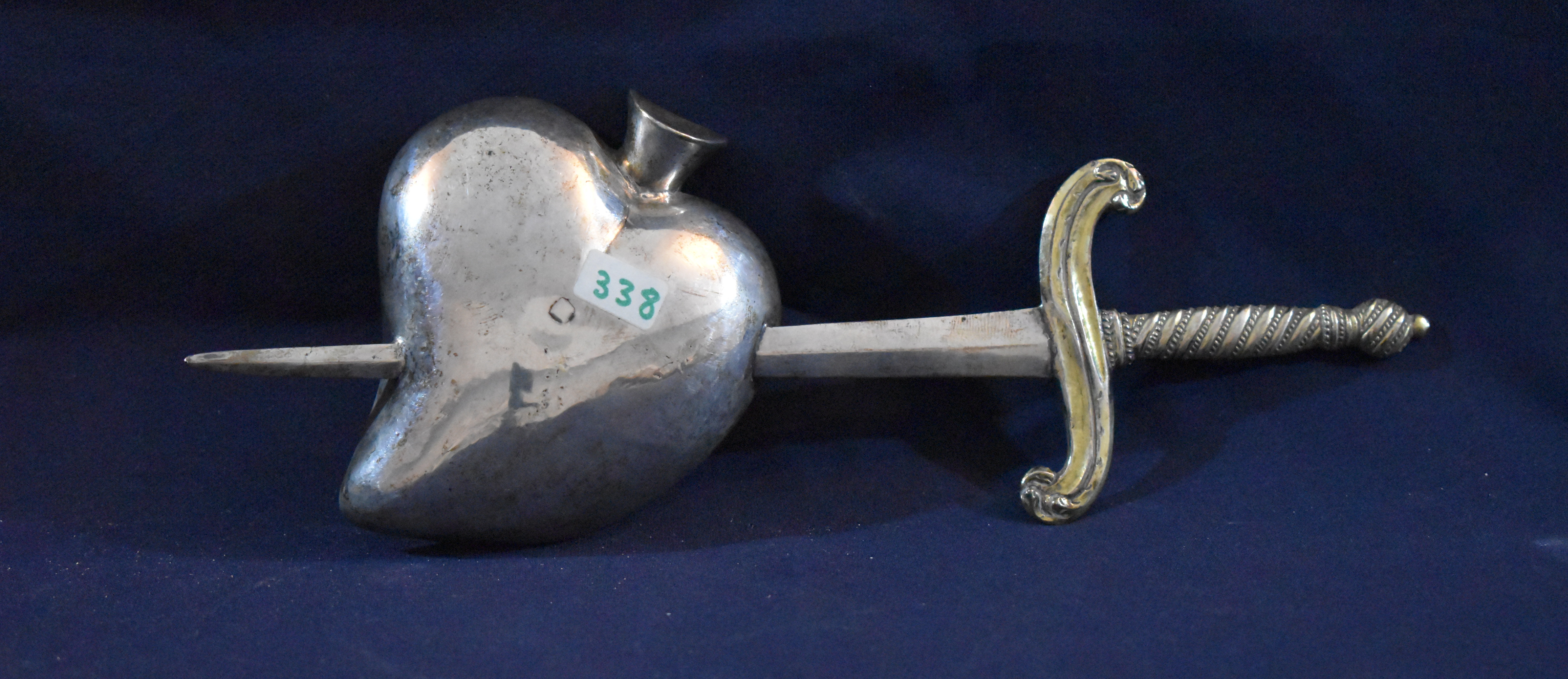 Corazón de chapa de plata atravesado desde su lado derecho por un puñal. Este último se clava aproximadamente hasta la mitad, tiene una biselada, guarda de forma tornapunteada y empuñadura entorchada con pomo esférico en el extremo.