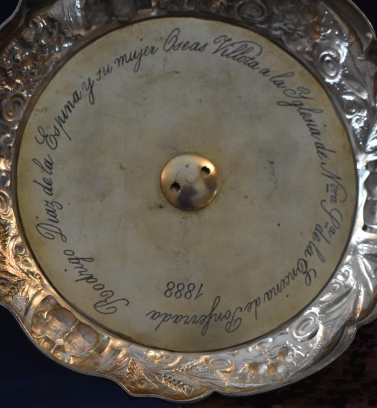 Inscripción en el interior de la base: Rodrigo Díaz de la Encina y su mujer, Oseas Villota, a la iglesia de Nuestra Señora de la Encina de Ponferrada. 1888
