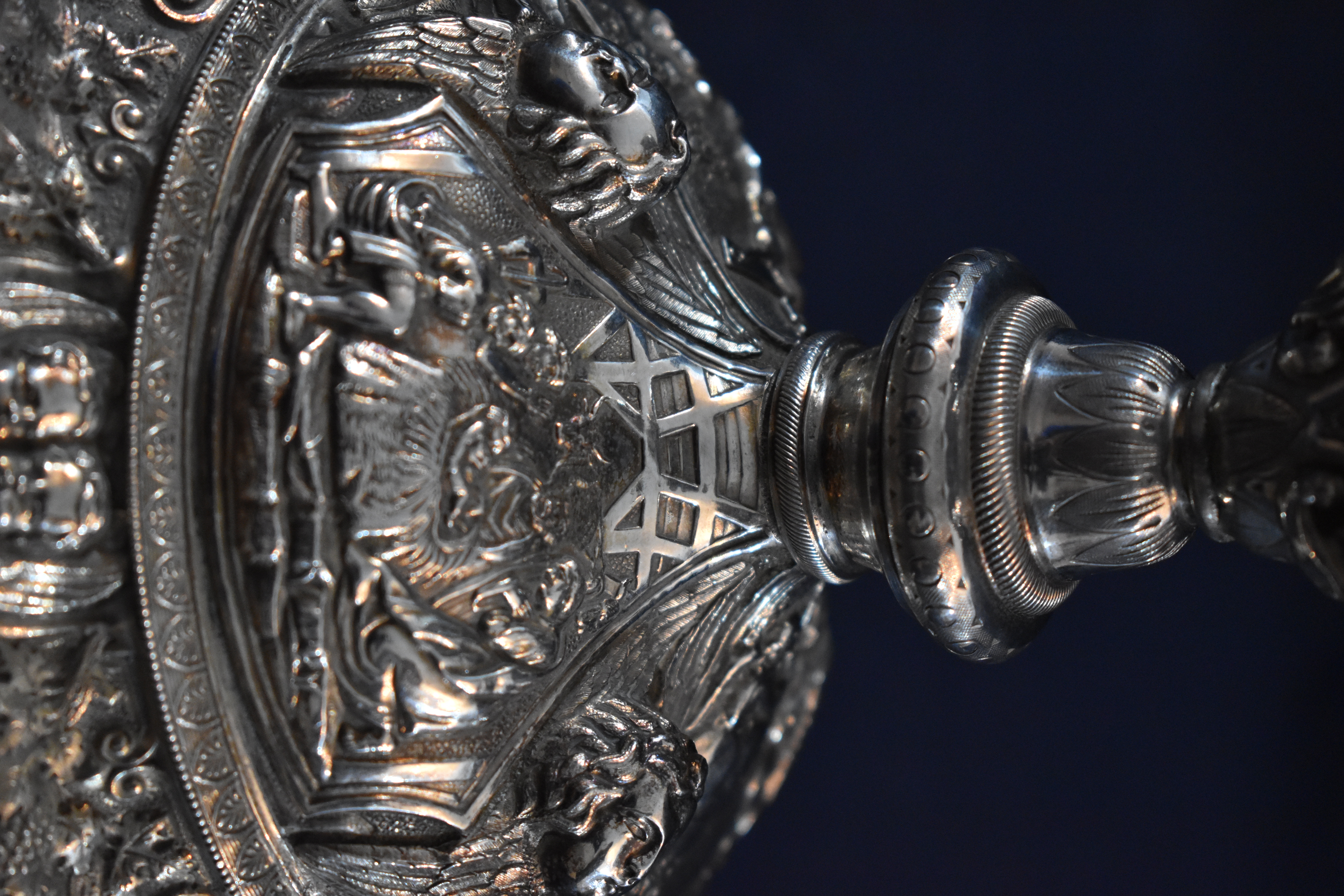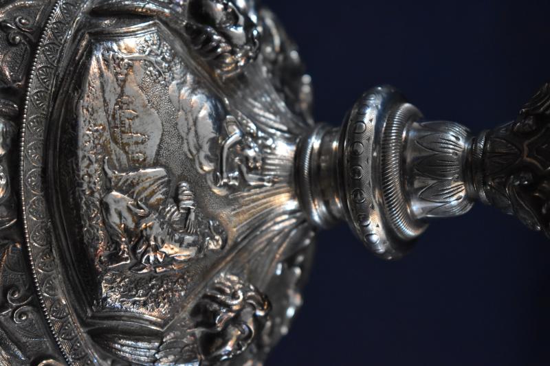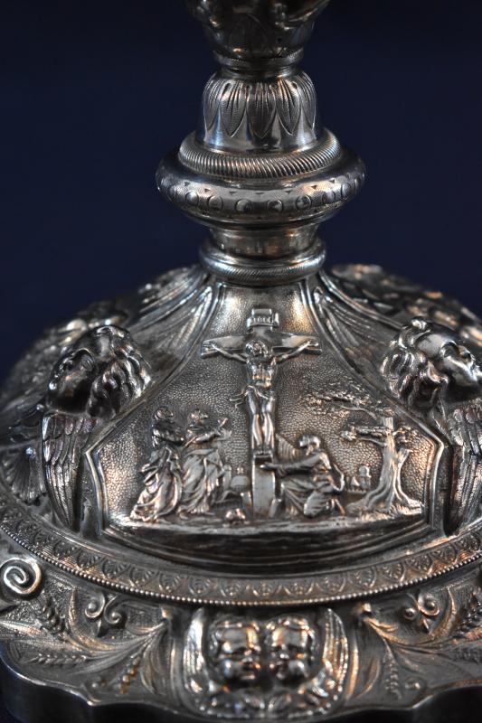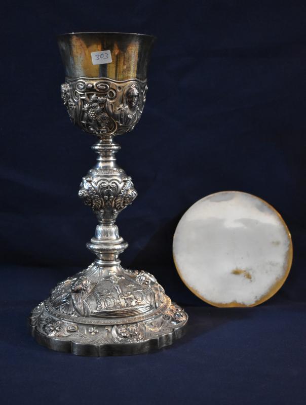 Rememorando la época más barroca de la plateria hispánica se creo este cáliz a fines del siglo XIX como ofrenda a la Virgen de la Encina. Su base de perfiles mixtilíneos acoge un pie abullonado, separado en dos partes, siendo la segunda de ellas de perfil curvo y la que se alza para acoger el astil. Este principia en una userte de gollete moldurado con formas cóncavo-convexas y un nudo globular. La copa tiene al perfil cilíndrico, pero los labios se abren e manera prominente y se labra toda la mitad inferior de la misma. En su decoración resulta ostentoso, con medallas con bustos, cabecitas de ángeles y escenas de la Pasión de Cristo.