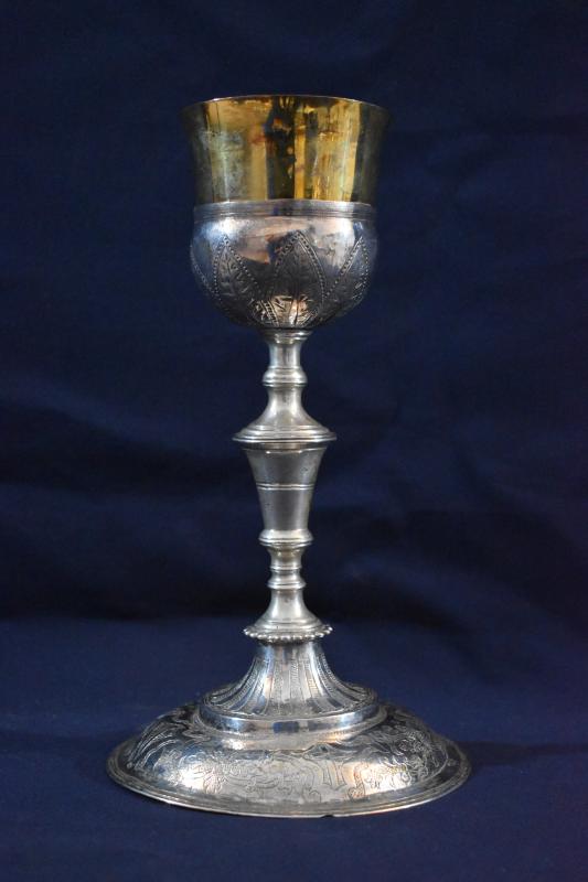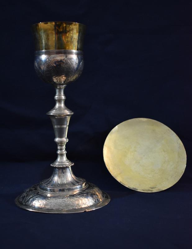 Cáliz recompuesto, formado por una base del siglo XVII y un astil y copa posteriores, del siglo XIX. La primera se compone de pestaña saliente lisa , cuerpo intermedio convexo y cuerpo superior troncocónico, todo ello labrado a buril con motivos vegetales, cartelas con cruces y acanaladuras. El astil principia en arandela perlada, desarrollándose sobre ella una estructura típicamente cordobesa y decimonónica compuesto por cuerpo troncocónico invertido sobre el que reposa el lado más ancho de otro de menor tamaño. Recogiendo la copa un cuello cilíndrico y sobre él una subcopa con corola de sépalos trabajada a buril e inserta en ella la copia propiamente dicha que va dorada. Lleva patena lisa