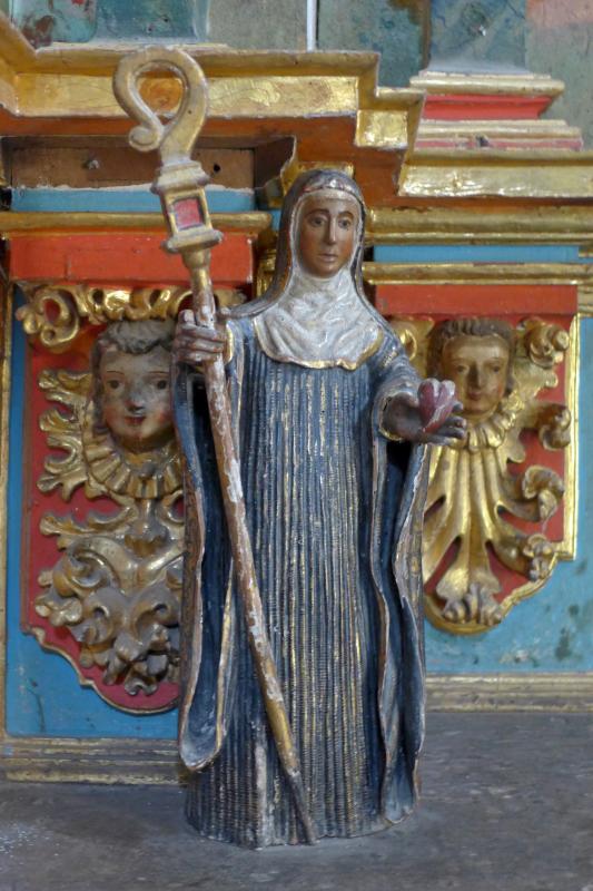 Pequeña talla de Santa Gertrudis, con la cogulla benedictina de simétricos pliegues muy finos y resaltante escapulario blanco. Enseña un corazón en su mano izquierda (su atributo) y sostiene un báculo en su derecha.
