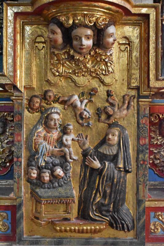 Santa Gertrudis, con hábito benedictino, se arrodilla ante la Virgen con el Niño, sentada esta sobre un nubaje con cabezas de querubines a su vez encima de una silla. Juguetones ángeles vuelan alrededor de estas figuras, así como cabezas de querubines.