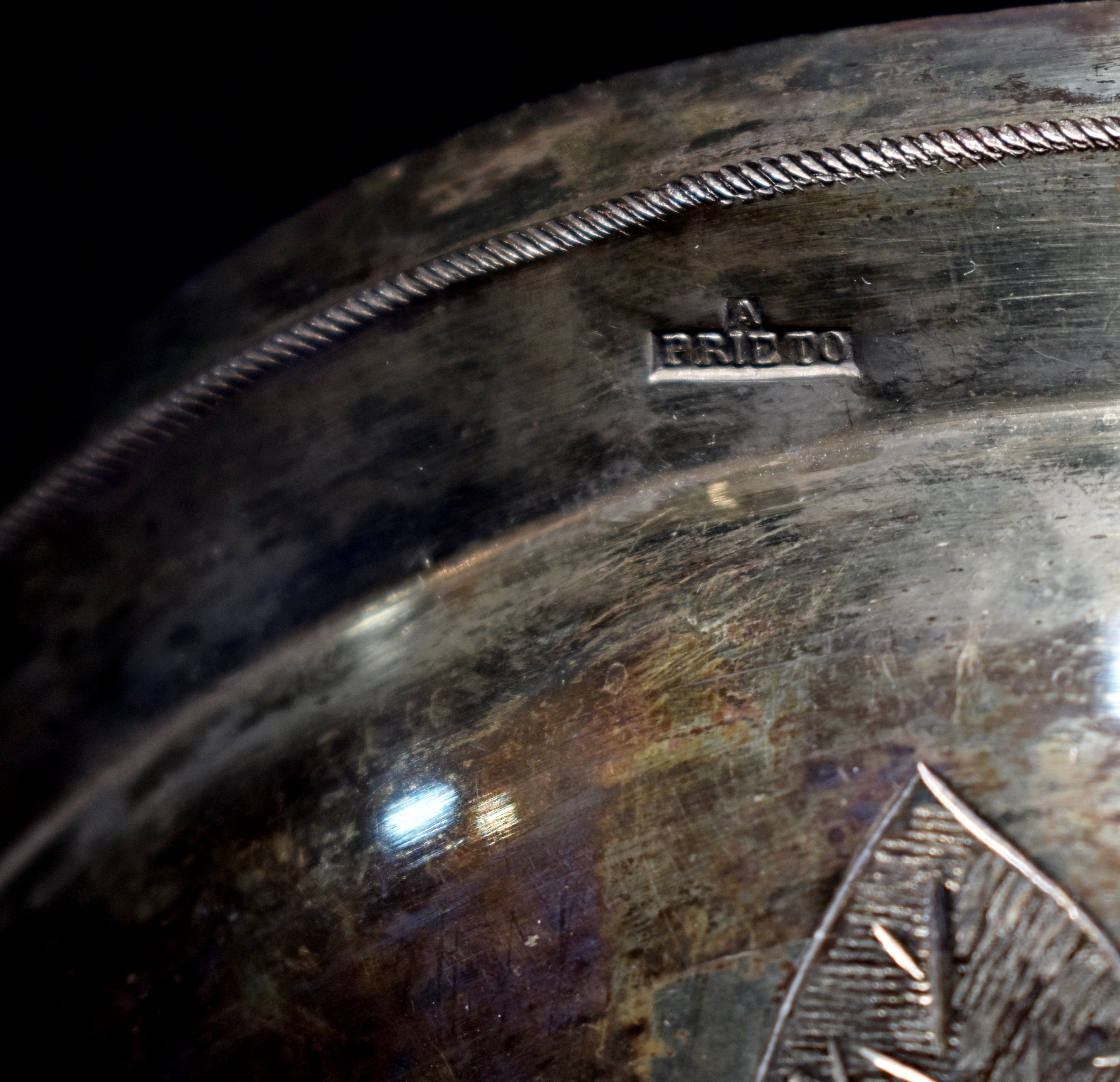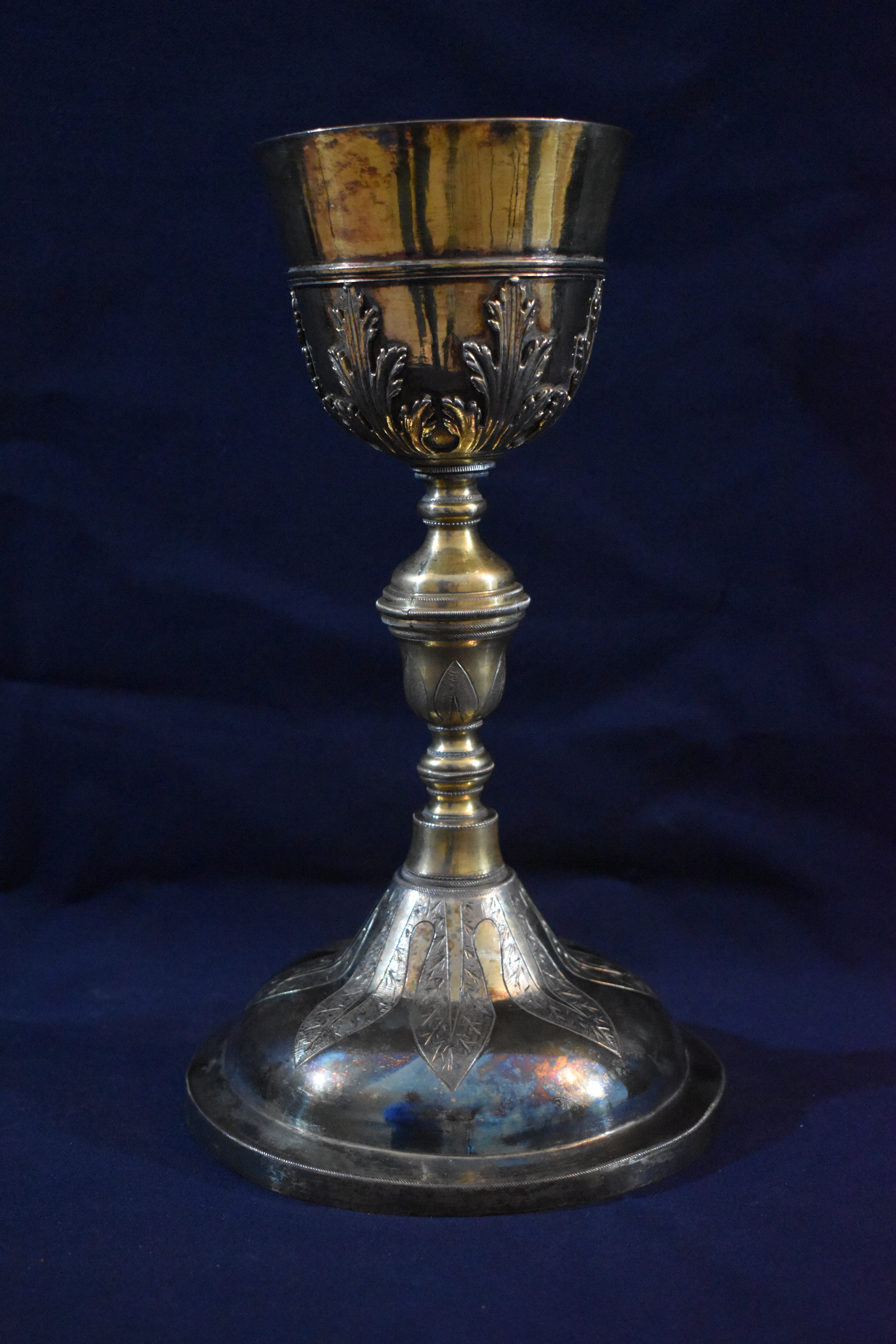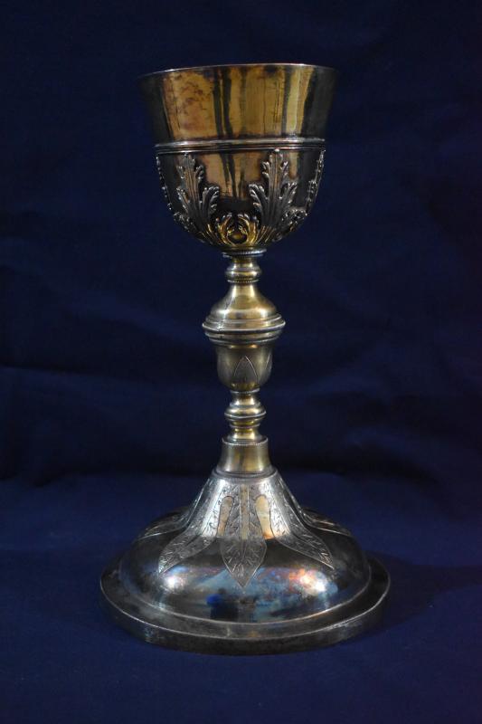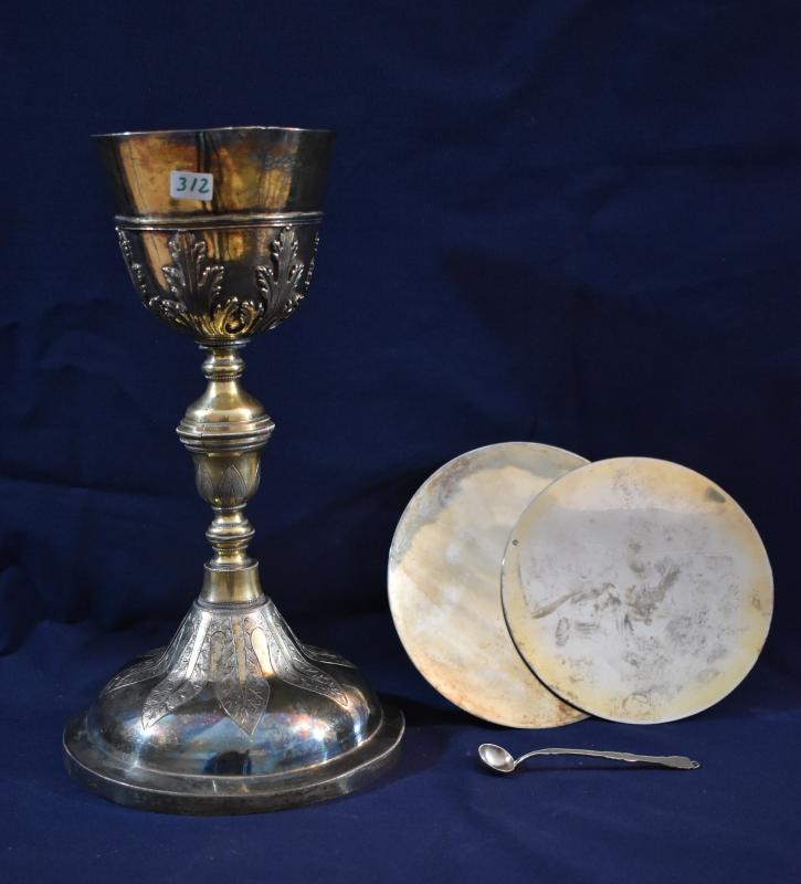 Sencillo cáliz de metal plata y metal plateado que sigue los modelos neoclásicos, pero sin perder de vista los exornos de la centuria anterior, quizá por la formación de su desconocido autor. Conta de pie con base saliente y cuerpo abullonado que se alza en forma troncocónica y astil torneado, compuesto de varias molduras y anillos que flanquean un nudo de tendencia ajarronada. La copa se divide en dos mitades gracias un listel saliente, disponiéndose en la inferior una corola de hojas similares a acantos. Este tipo de exornos, pero únicamente incisos y con hojas lanceoladas se dispusieron en la parte inferior del nudo y en la propia base. Se acompaña de dos patenas de plata de distinto tamaño y una cucharilla de idéntico material.
