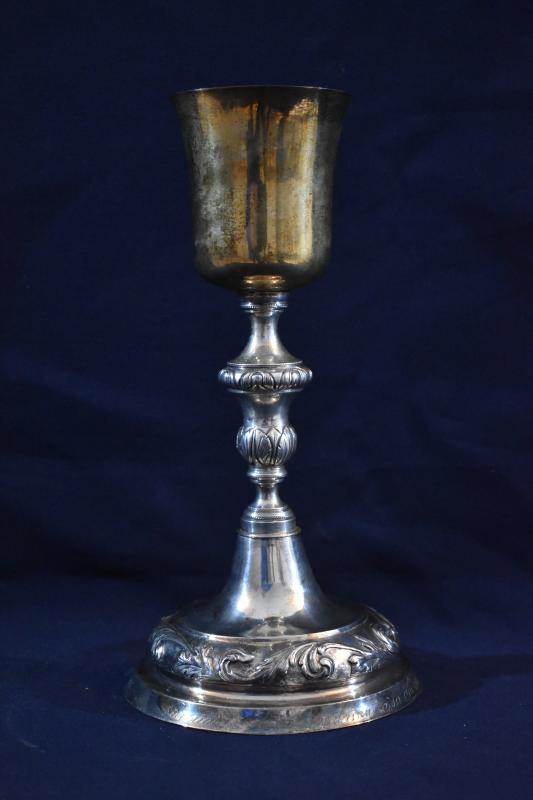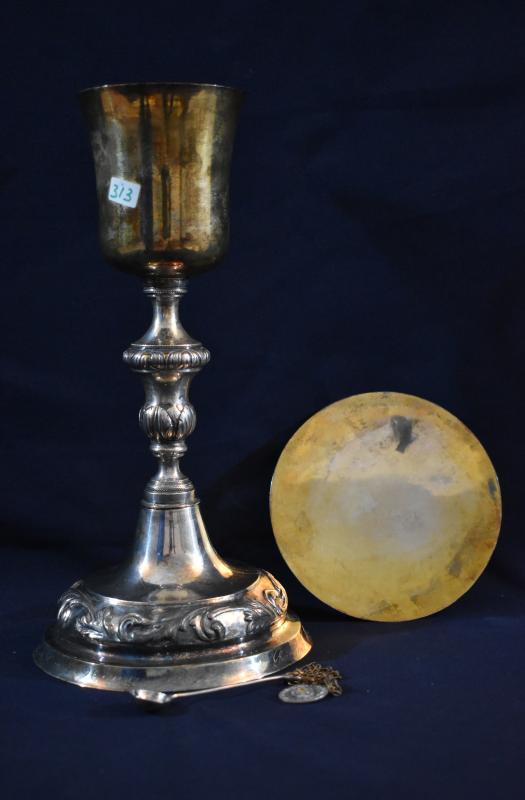 Pie de perfil circular con zócalo alto y liso, que remata en un cuerpo intermedio de perfil abocelado. Sobre éste, remetido con respecto al basamento, un cuerpo de superficie cóncava que se alza a modo de cono truncado para recoger el astil. En este, ocupa el centro un estilado nudo ajarronado flanqueado por dos cuellos cilíndricos. La copa, lisa y troncocónica es la única parte del conjunto que va dorada exteriormente. El repertorio decorativo es escaso, limitándose al cuerpo central de la base, donde se desarrolla una cenefa de hojas, y en el nudo con similar decoración, tanto en su parte inferior, como en la superior, además de varias orlas troqueladas. Se completa con patena lisa de plata y cucharilla de metal plateado