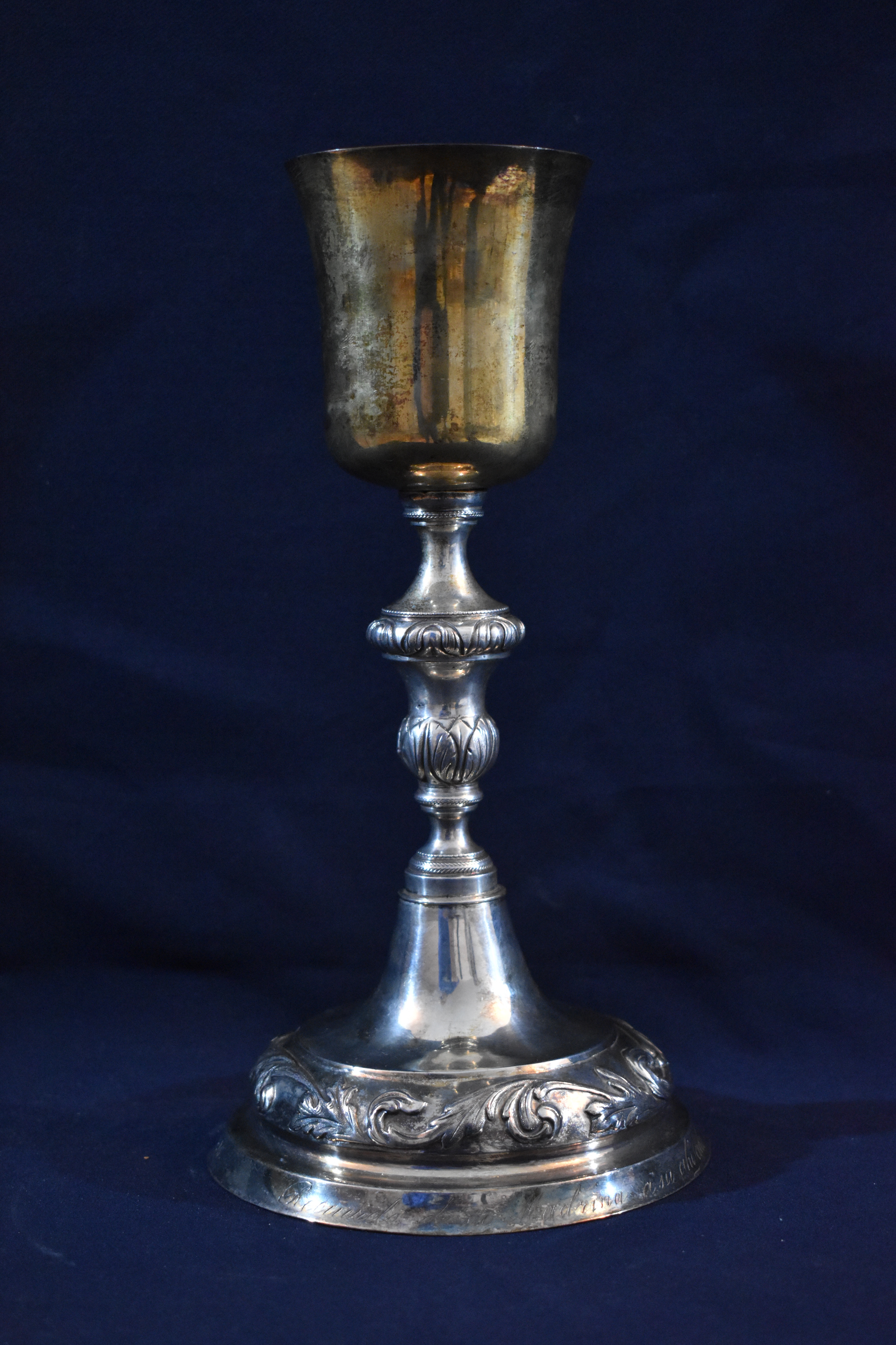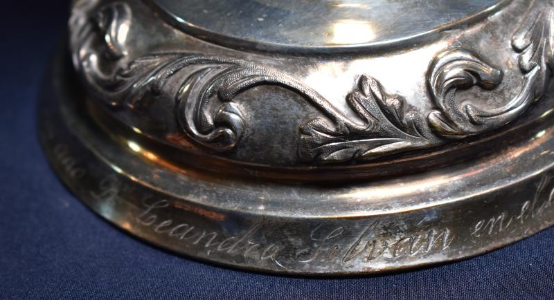 Inscripción en el exterior de la base: "Recuerdo de su madrina a su ahijado, don Leandro Silván, en el día de su primera misa. 26 junio 1896"