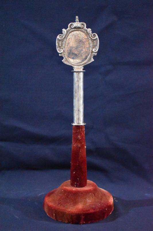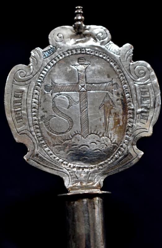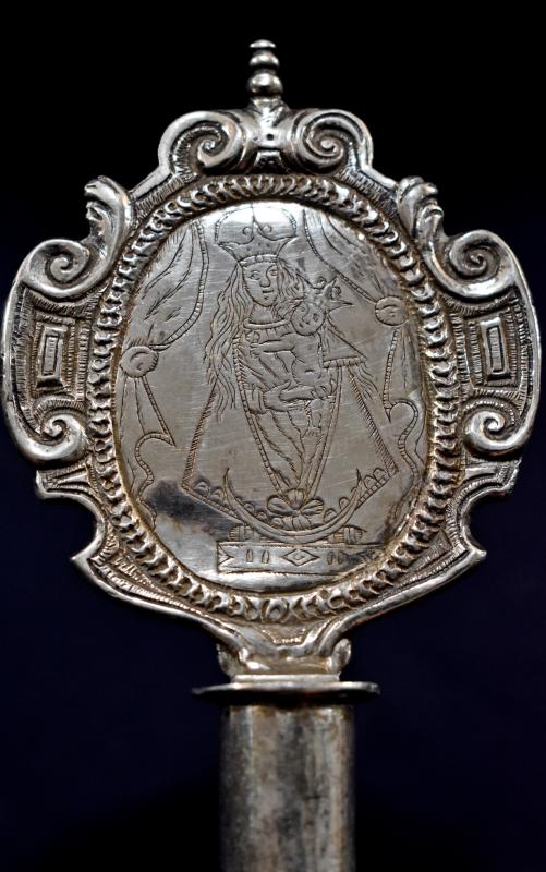 Remate de vara, compuesto de cañón cilíndrico liso con arandelas arriba y abajo, e insignia en su parte superior. Esta es la parte más interesante del conjunto adoptando unos movidos perfiles, como se una tarja de cueros recortados se tratase. En el anverso se grabó una imagen mariano sobre peana de piedras y gallones (quizá la propia Virgen de la Encina), mientras en el reverso lleva una cruz sobre Calvario, flanqueado por la letra "S" capital y un clavo, emblemas de la cofradía de la Esclavitud.