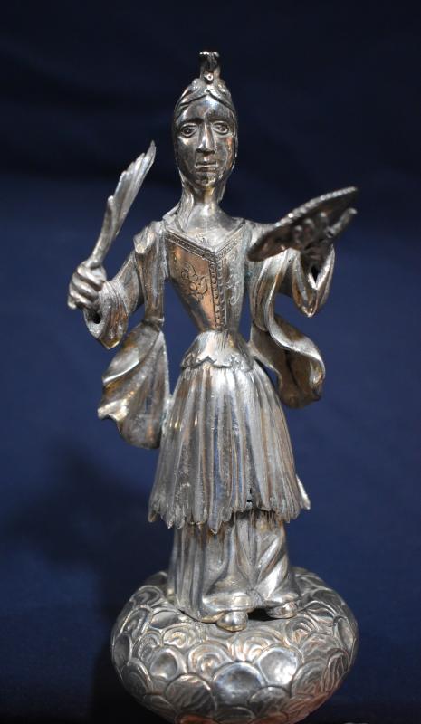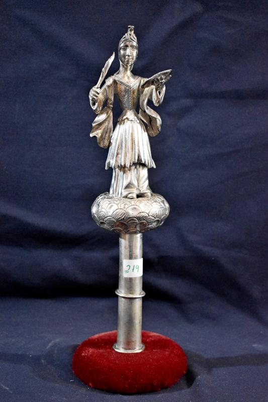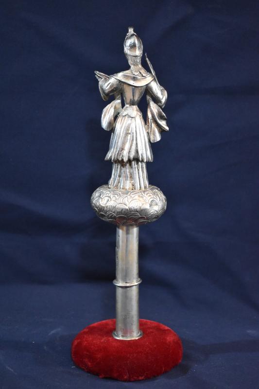 Vara de cofradía compuesta de cañón con dos piezas cilíndricas flanqueadas por arandelas, y la insignia propiamente dicha, que se alza sobre una suerte de pequeña macolla globular. El emblema es una figura de bulto de Santa Lucía, fundida en plata, reconocible por los atributos iconográficos habituales, esencialmente la palma del martirio y una bandeja con sus ojo. Por lo demás, resulta de cierto interés el movido trabajo de sus vestiduras.