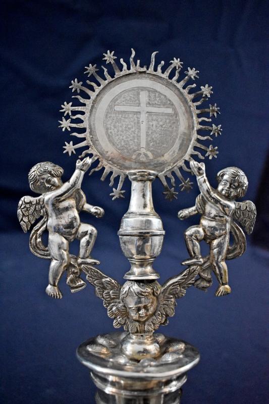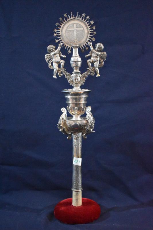 Como la mayor parte de los remates de vara recogidos en la basílica de la Encina, consta de cañón para enmangar e insignia. Esta última es la que hace visible la pertenencia de la pieza. En este caso, se trata de un emblema de notable elaboración al contar con una especie de doble macolla, la inferior semiesférica con costillas fundidas y aplicados y sobre ella otra a modo de nudo acampanado con gallones en su base. El remate lo integran se angelitos, dos en pie y bajo ellos un cabecita de querube, que sustentan la insignia de la cofradía, inscrita en un disco con resplandor de rayos. En su interior una cruz sobre Calvario. Quizá perteneciera a una cofradía de la Vera Cruz.