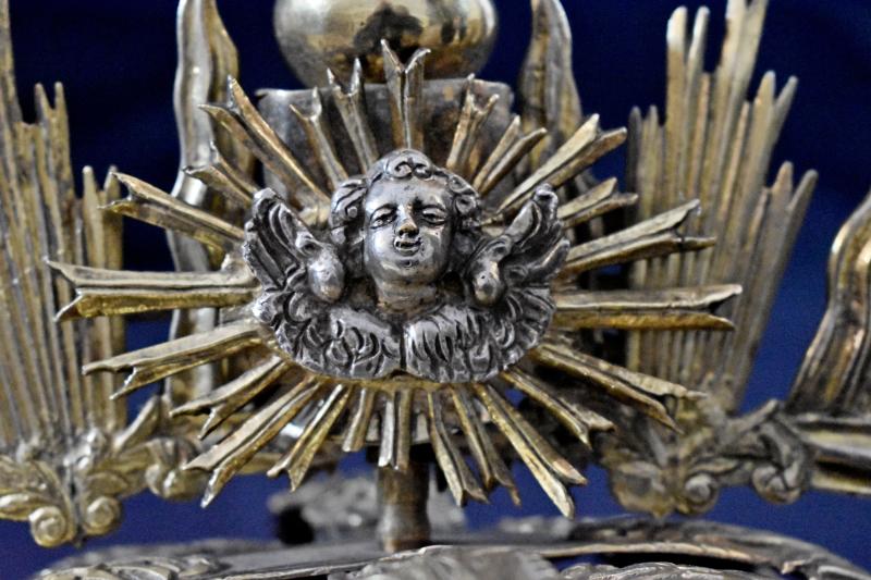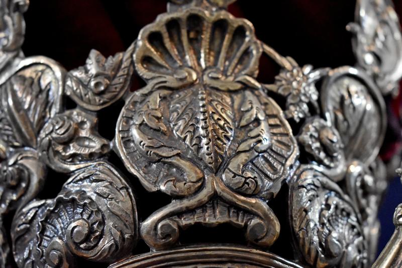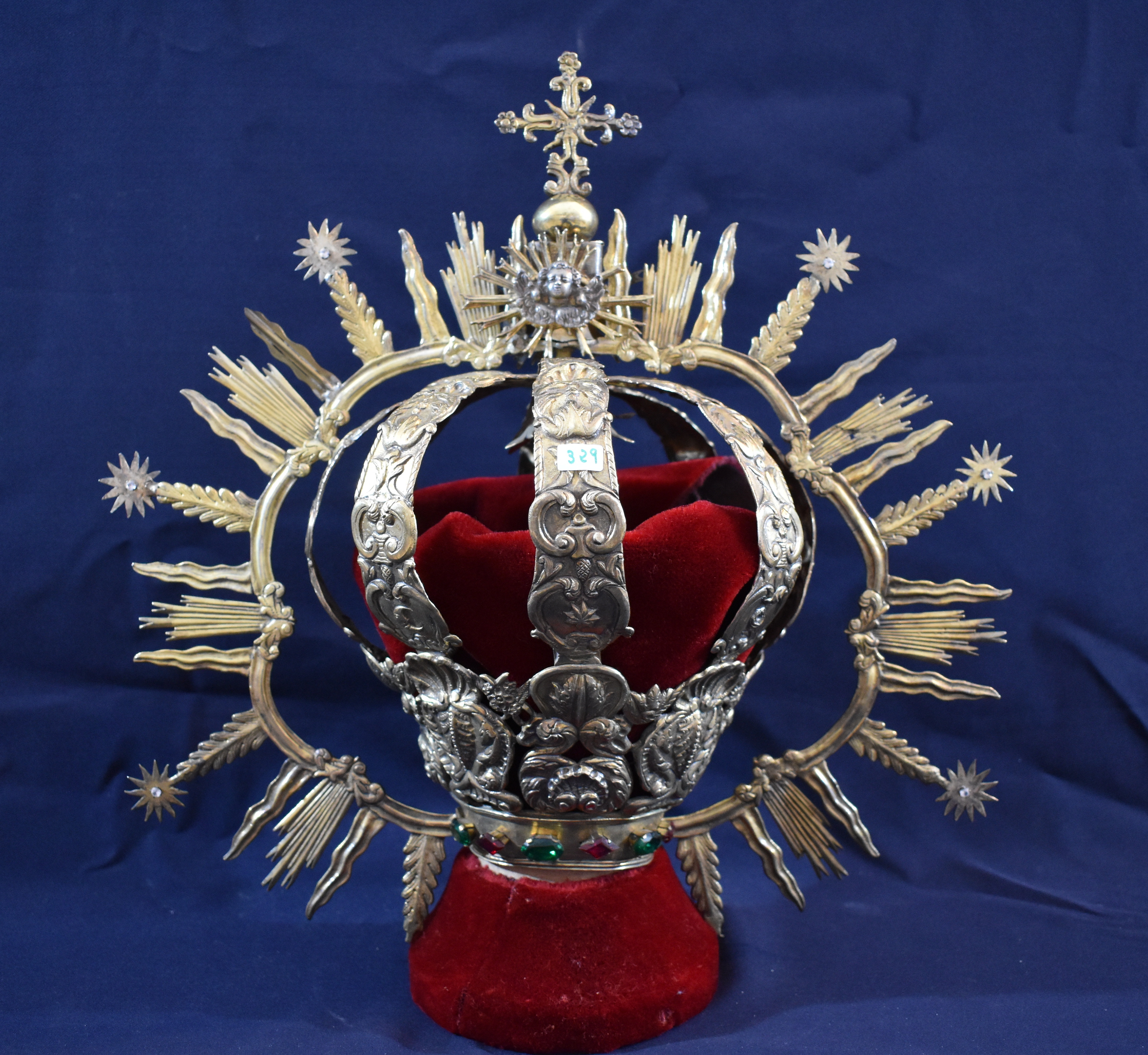 Esta corona sigue el modelo tradicional de corona real cerrada con halo o resplandor a su alrededor que suele colocarse sobre las imágenes mariana. Consta de aro liso y sobre ella un cuerpo repujado con rocallas, veneras, ces y motivos vegetales. De él parten ocho imperiales que confluyen en la parte superior. Cada uno de ellos, elaborado en chapa de plata, porta cartelas conformadas por ces afrontadas que acogen emblemas marianos de las Letanías Lauretanas. Alrededor de la corona un resplandor lobulado, compuesto por ces, del que parten haces de rayos de distinto formato, salvo en su parte central, de donde emerge el orbe con una cruz de travesaños flordelisados y una cabeza de querubín con su propio resplandor.