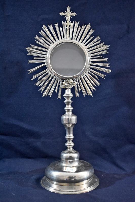 compuesto por un cuerpo cilíndrico con dos elementos troncocónicos enfrentados por sus lados de mayor diámetro y dos anillas que enlazan con el ostensorio. Este es bastante sencillo, con viril circular y haz de rayos biselados. El aparato decorativo se limita a la cruz de remate y a un aplique con querubes en el punto de unión de astil y viril, ambos dorados.