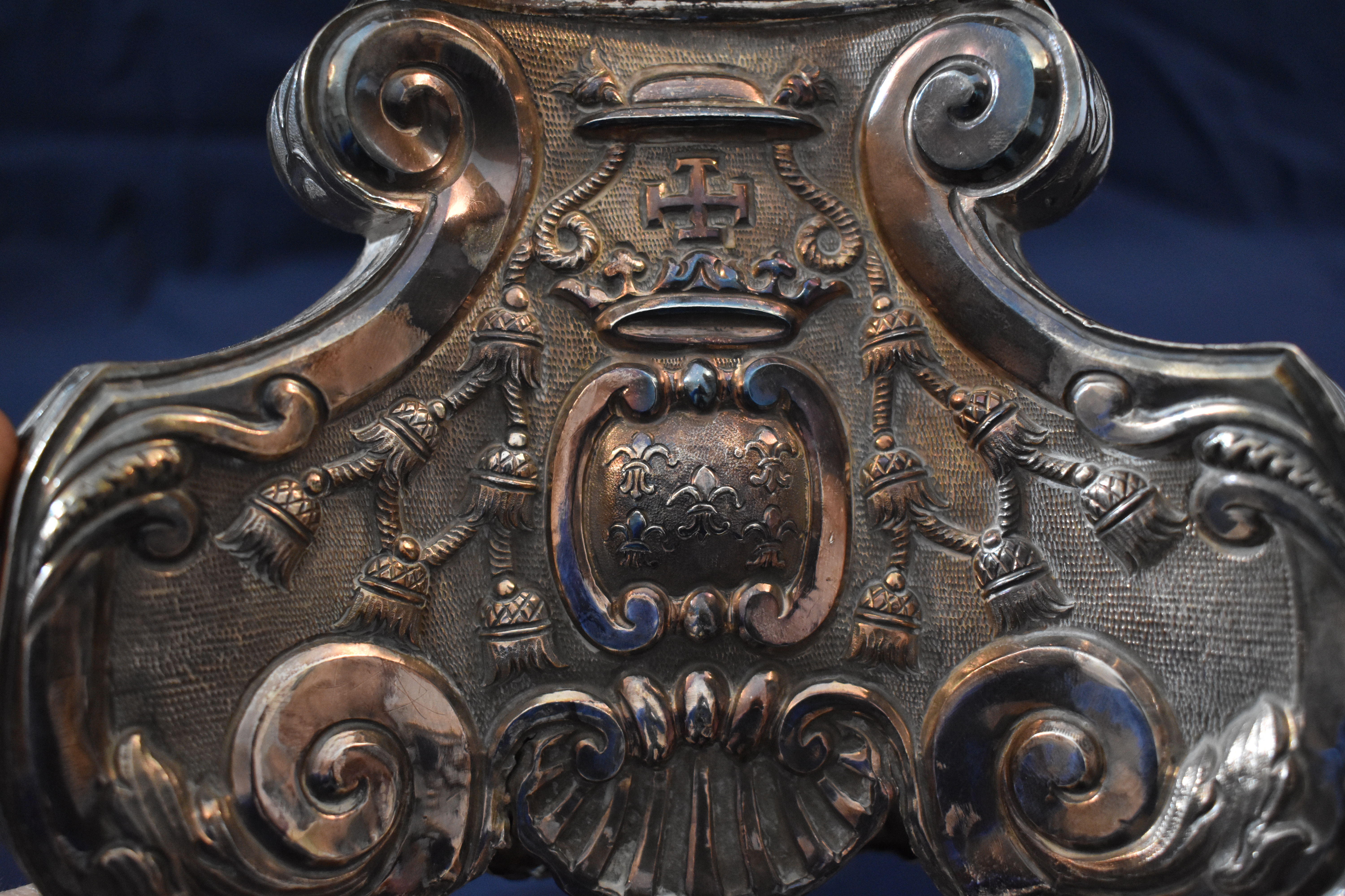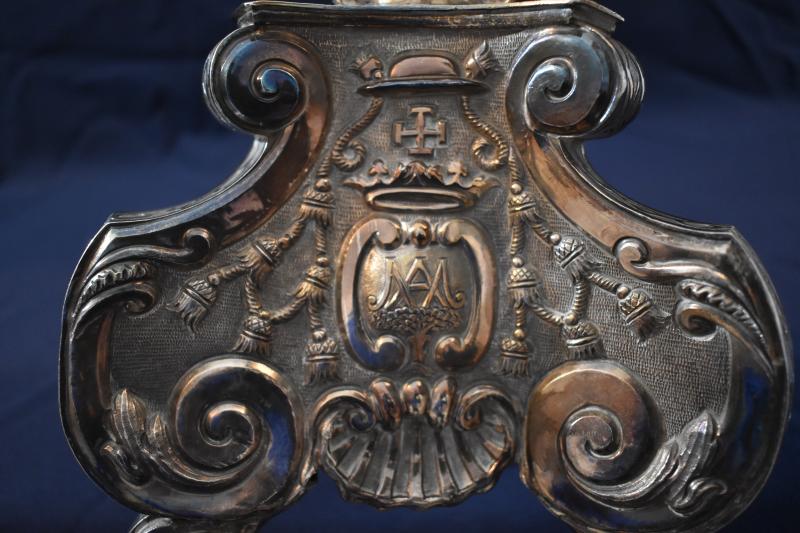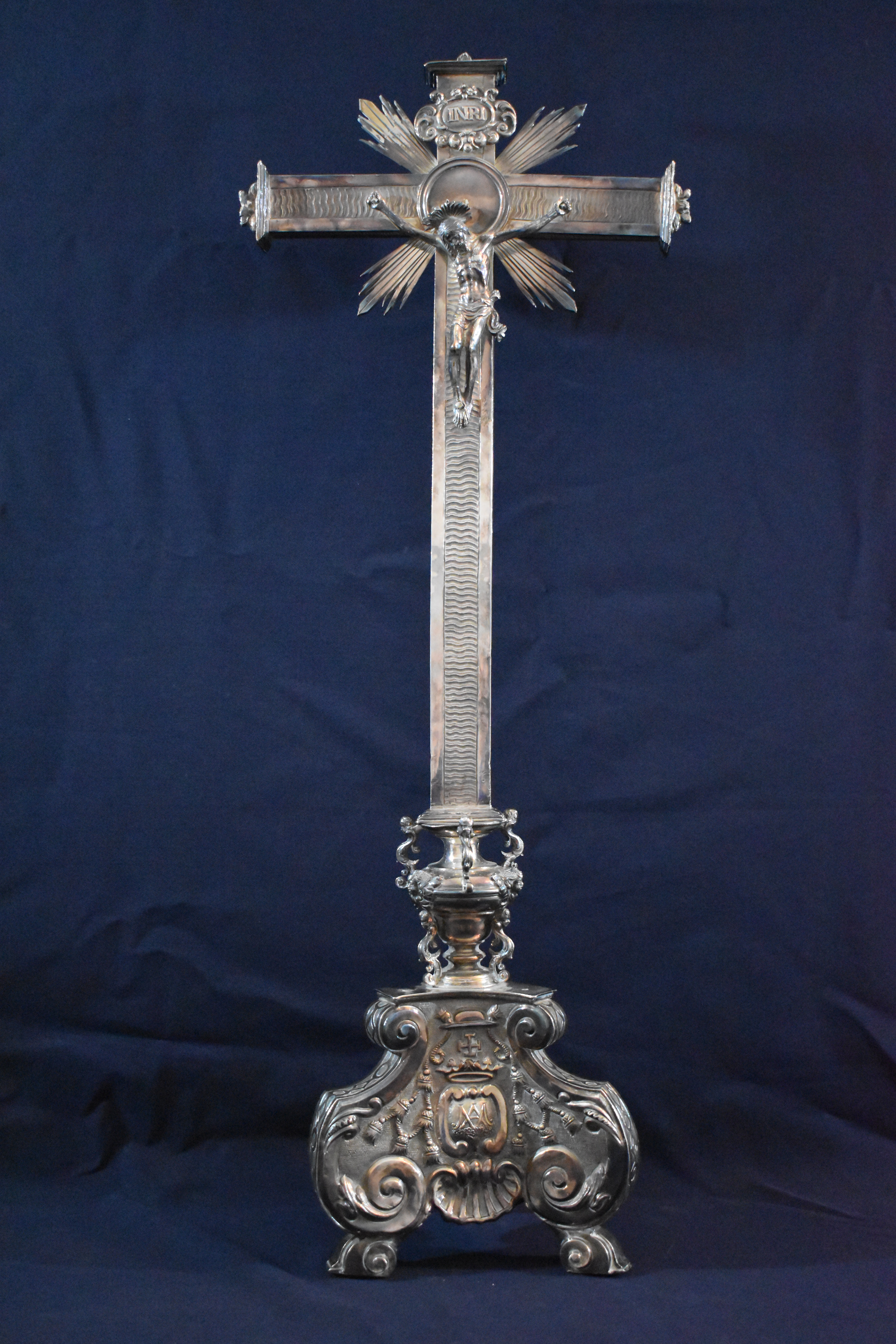 Cruz de altar asentada sobre pie de sección triangular y perfil tornapunteado. Sus tres caras recogen motivos fitomorfos, conchas, una cartela coronada compuesta por dos ces afrontadas (acogen un emblema mariano, dos lobos pasantes y cinco flores de lis en sotuer) y todo ello rematado por un capelo con sus correspondientes borlas.