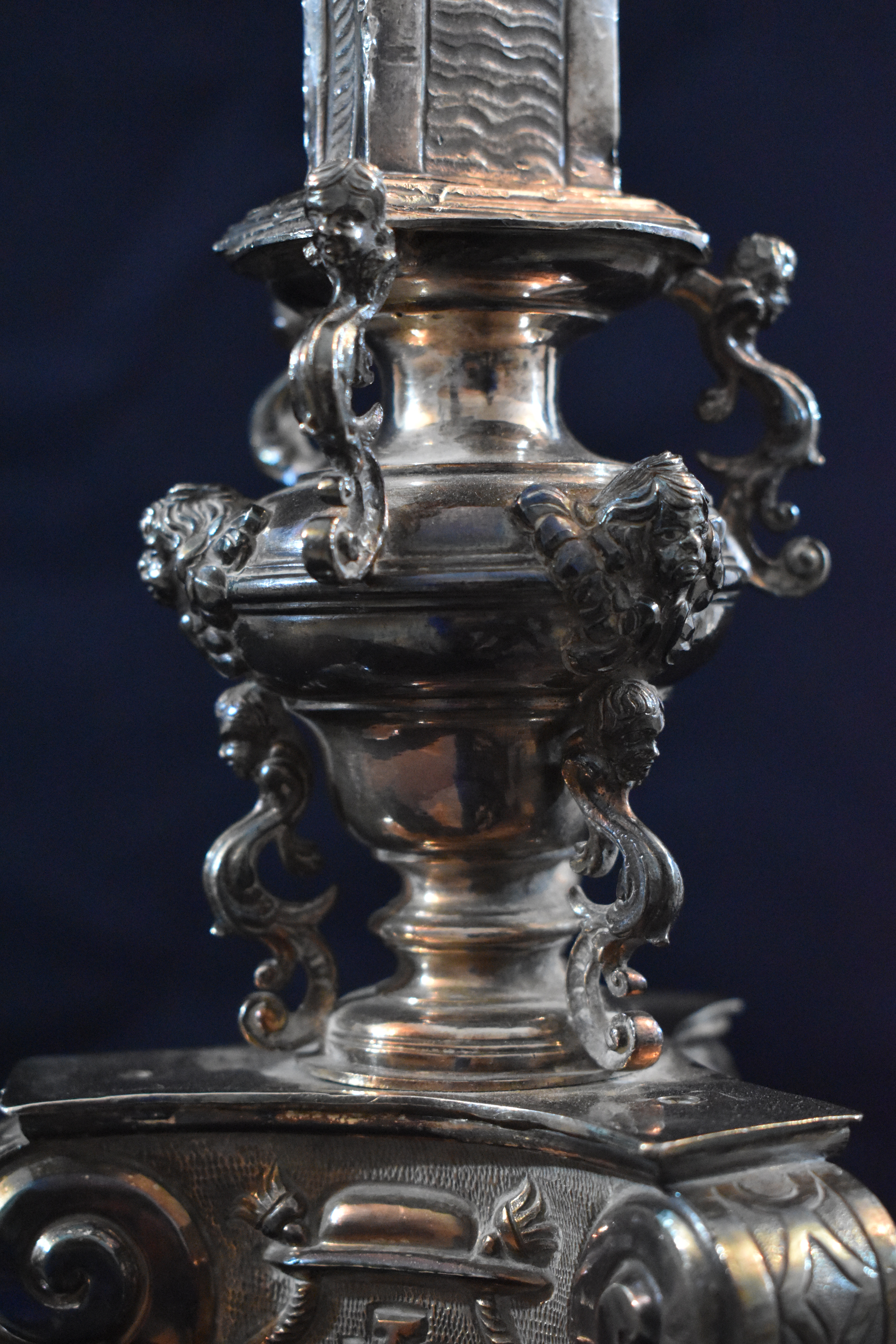 Sobre esta peana se colocó un nudo de dos pisos, el primero ajarronado y el segundo cilíndrico, jalonados por una especie de bichas fundidas y aplicadas radialmente entre las que asoman cabezas de querubes.