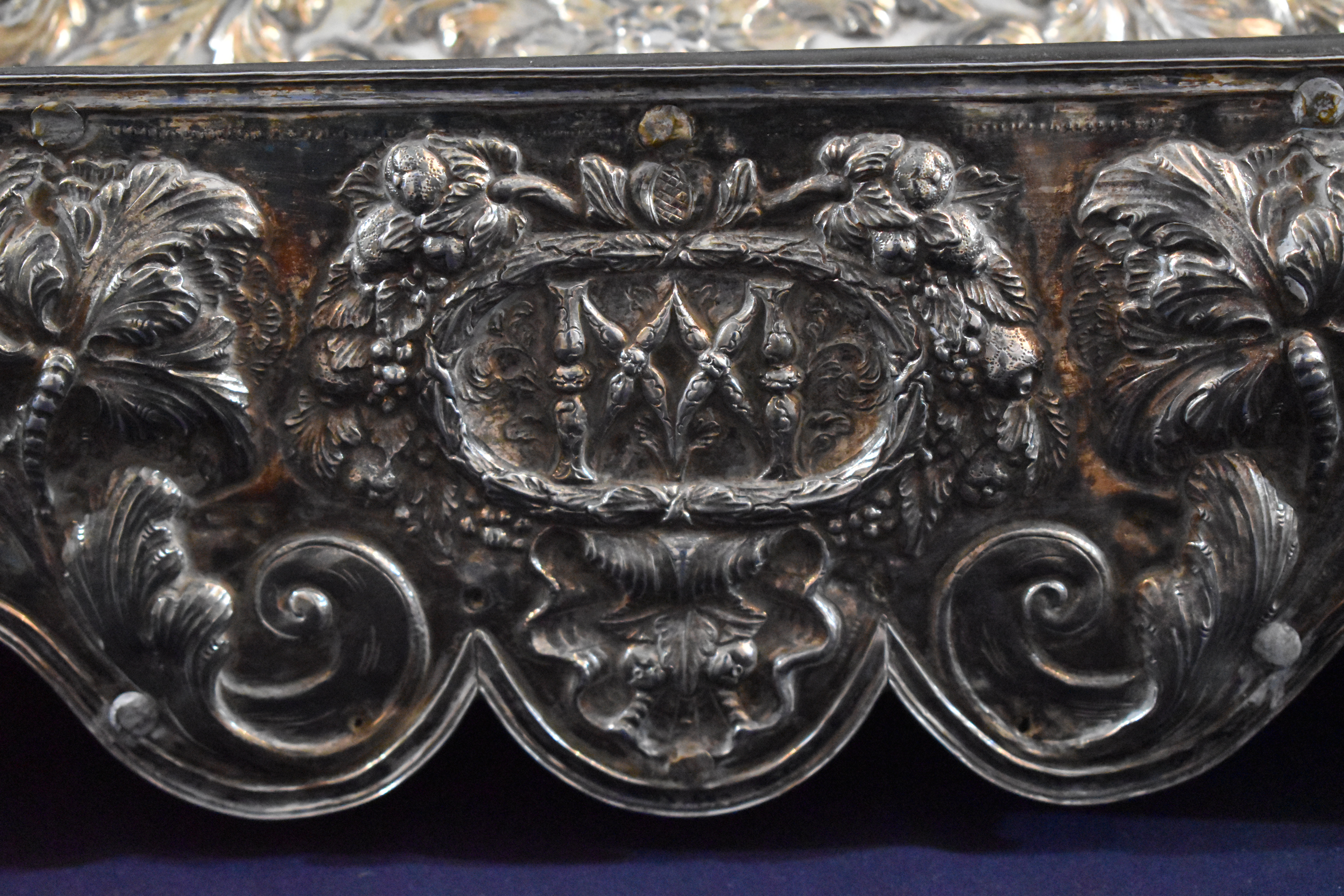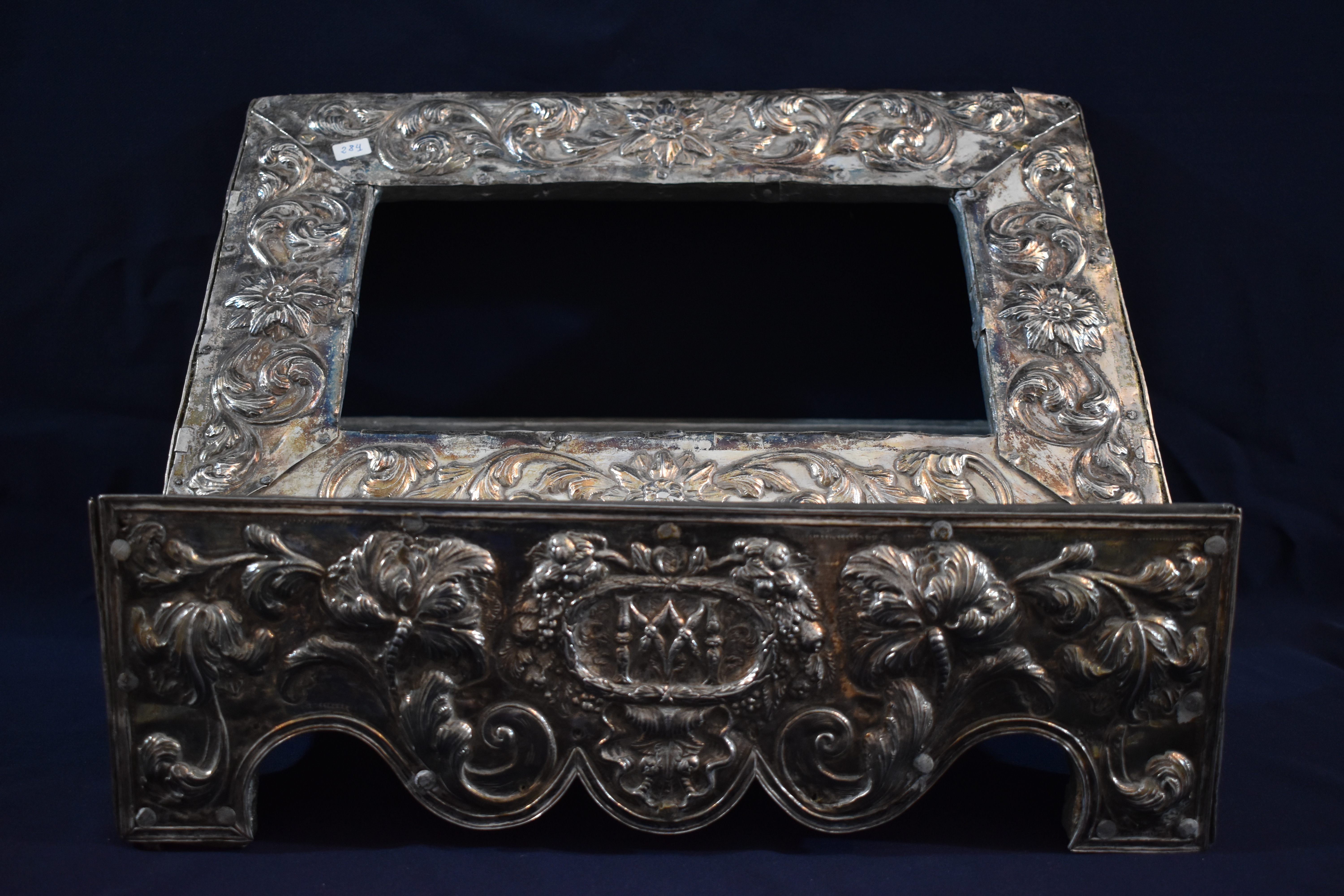 Sobre un alma de madera se dispusieron diversas planchas de fina plata cubriendo cada una de las piezas del atril. La labor de repujado se centro en la captación de diversos motivos vegetales, hojas y flores, que son los predominan en todo el conjunto. Varía tan sólo en centro de la plancha frontal, compuesta como una cartela oval con el emblema mariano, rodeado por colgantes de frutas y soportado por una especie de concha arrocallada.