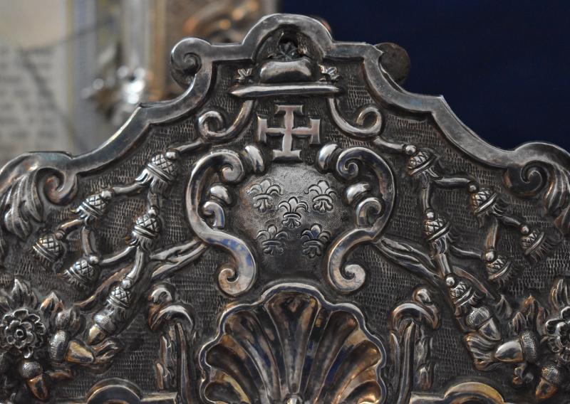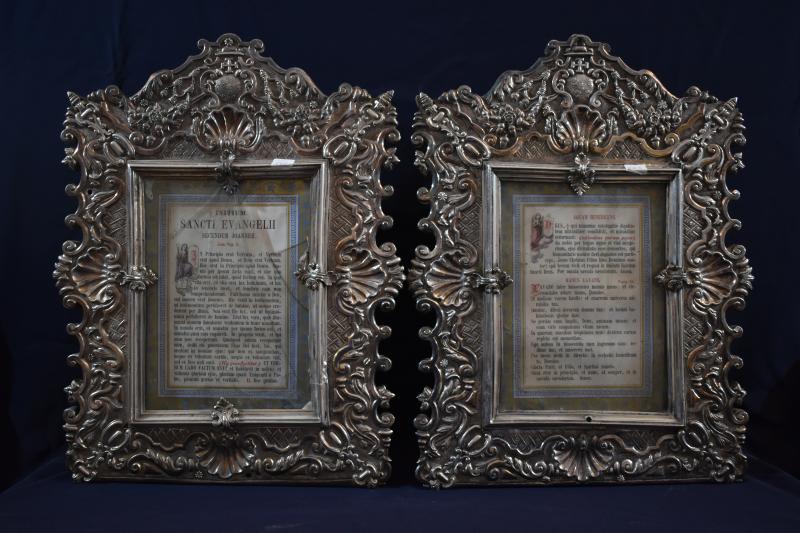 Del juego de sacras donadas por el obispo Florez, las dos menores son idénticas y su forma tiene al rectángulo, aunque con unos perfiles sumamente movidos. Ces, rocallas, conchas, tornapuntas y motivos florales se disponen sobre un fondo de reticula rombal. La parte superior, como si de su coronamiento se tratase, acoge las armas de obispo (cinco flores de lis en sotuer) en una cartela circular con tornapuntas rematada por un capelo con sus correspondientes borlas. Bajo ellas aparecen una serie flores y bellotas, estas últimas alusivas seguramente a la basílica de la Encina y su Virgen.