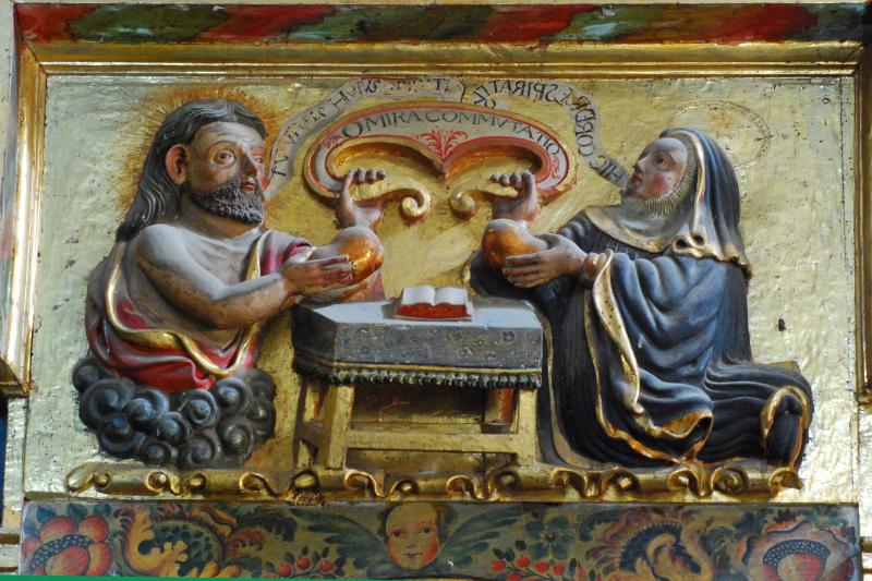 En los extremos de una mesa baja donde se encuentra un libro abierto (la Biblia) departen Cristo, representado de medio cuerpo sobre nubaje y santa Gertrudis, arrodillada, con hábito benedictino. Ambos muestran un corazón en sus manos, y de las otras arranca una cartela compartida con esta inscripción pintada: O MIRA COMMUTATIO. De la boca de Cristo sale un mensaje pintado en una filacteria: TU VIVIS HUIUS SPIRITU. De la boca de santa Gertrudis, otra, con las letras escritas especularmente: HIC CORDE RESPIRAT TUO, versos extraídos de un himno recitado en las vísperas de la festividad de santa Gertrudis (15 de noviembre).