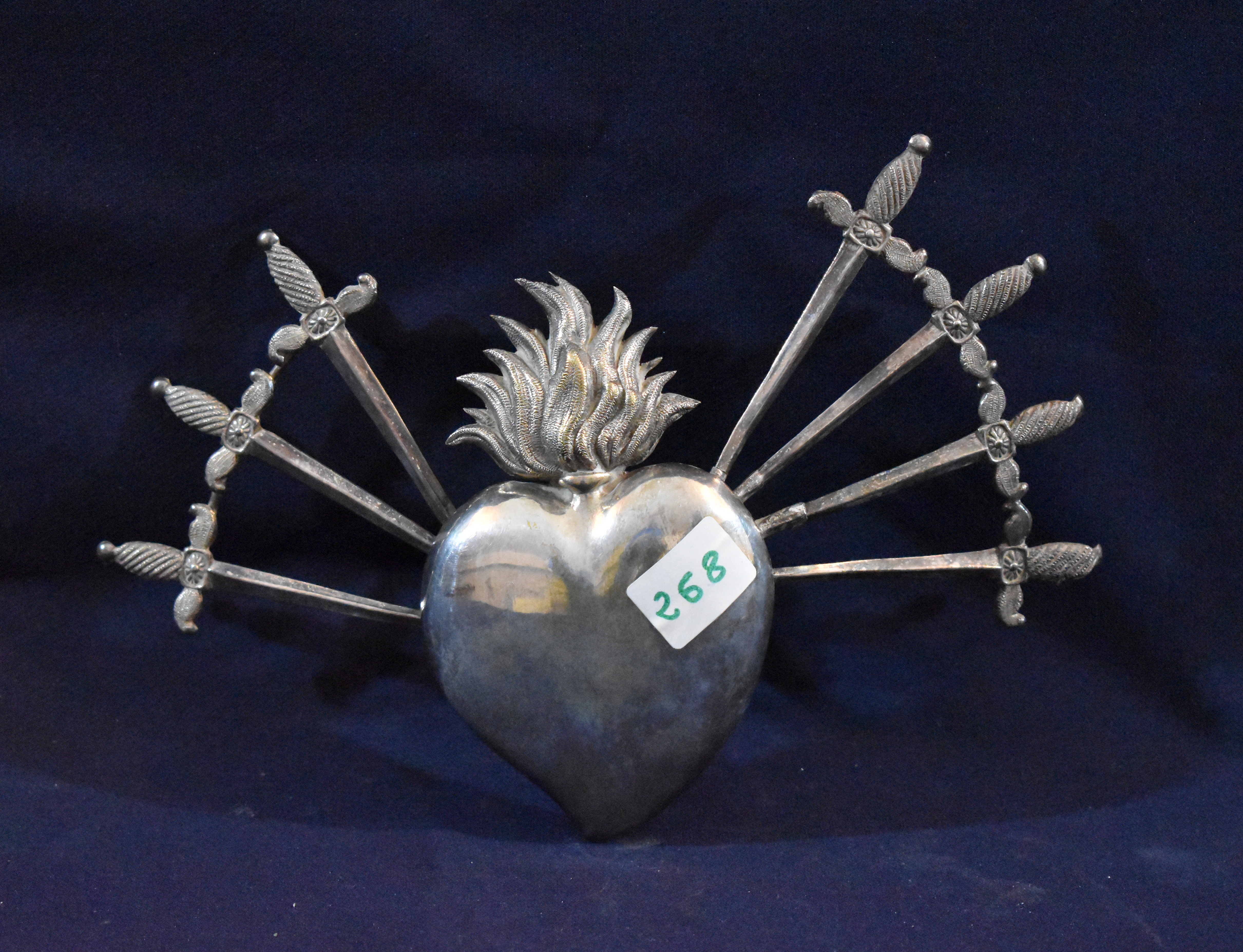 Pieza central en forma de corazón ligeramente asimétrico con su parte superior llameante. A sus flancos se colocan siete cuchillos o dagas (y no seis como otro de los ejemplares inventariados), que aluden a los Dolores de la Virgen. Estos tienen hoja biselada, guarda plana y en forma de tornapuntas y empuñadura entorchada.