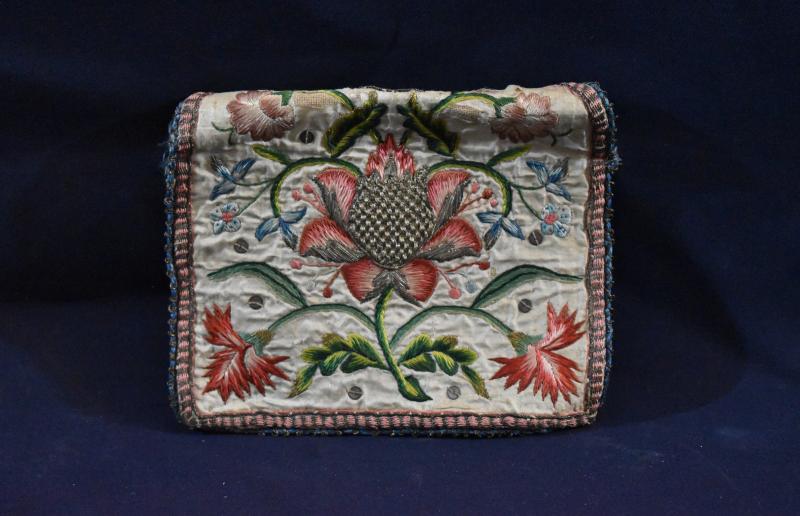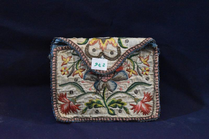 Carterita de forma rectangular con solapa triangular. Está realizada con dos piezas de tela (además de forro interior) que se han cosido a mano y en cuya superficie se han bordado diversas composiciones vegetales con hilos de color. Es posible que fueran ideadas para guardar algún tipo de ofrenda a la Virgen.