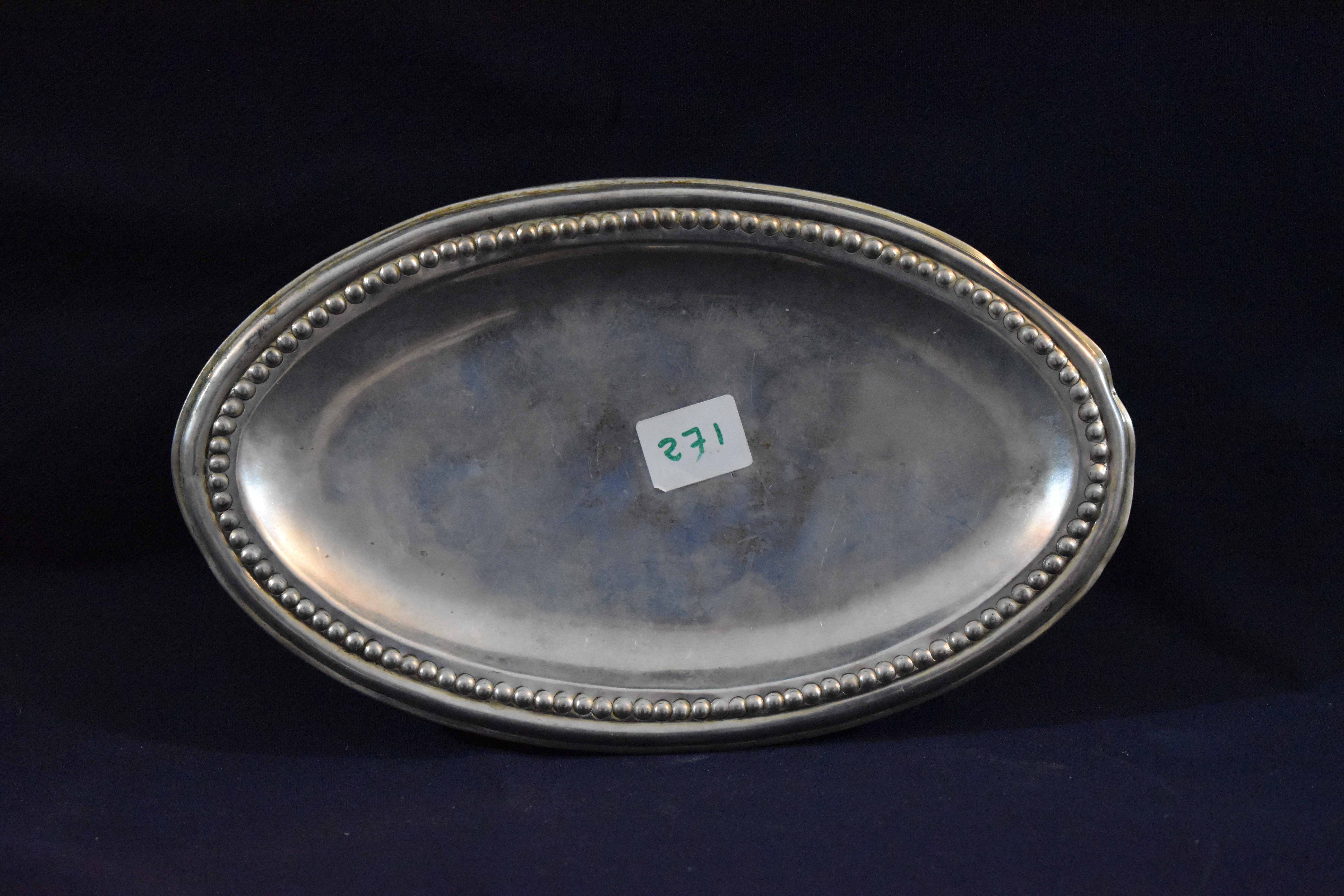 Bandeja ovalada de campo liso, falta cóncava y borde moldurado con cenefas perlada elaborada por troquelado mecánico. Pieza funcional, aunque sin renunciar de todo a un leve toque ornamental.