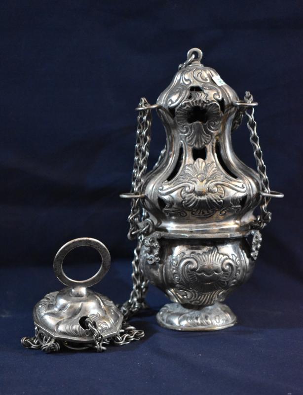 Pie de movido perfil, pero tendente al círculo, ligeramente moldurado y de escasa altura. Brasero o cazoleta de forma bulbosa. Cuerpo de humo de perfil orgánico, pero en líneas generales tendente a la forma cónica y rematado por una cubierta cupulada. El manípulo es igual en su forma al pie del incensario, pero adquiere forma abombada y se remata con una gran anilla circular. Toda la estructura se une mediante cuatro cadenas. En su ornamentación abundan las rocallas, los tornapuntas y las ces arriñonadas, como es propio de su estilo rococó.