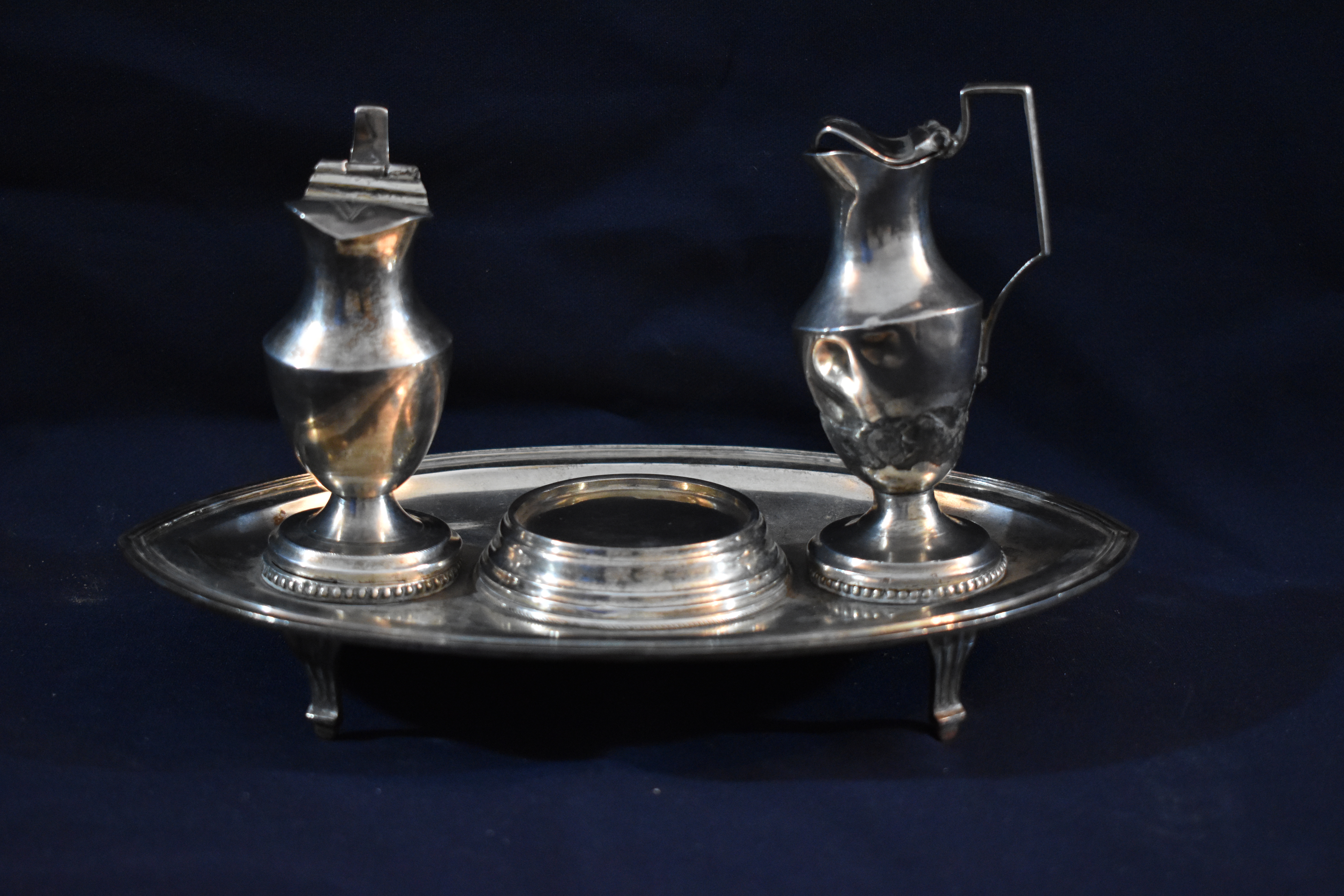 La salvilla tiene forma oval, va decorada en su borde exterior con una sencilla moldura y se asienta sobre cuatro patas de perfil triangular.