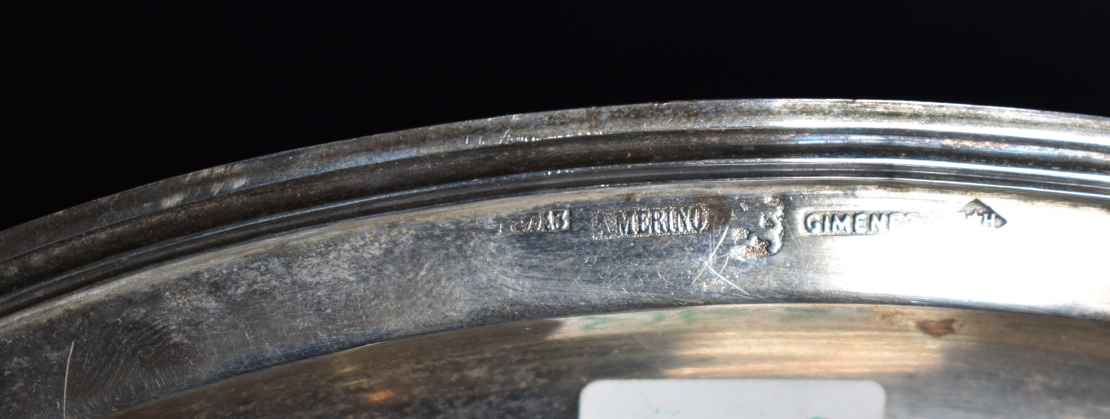 Punzones en el borde de la bandeja: A.MERINO, GIMENE[...], Escudo con león rampante (Córdoba)