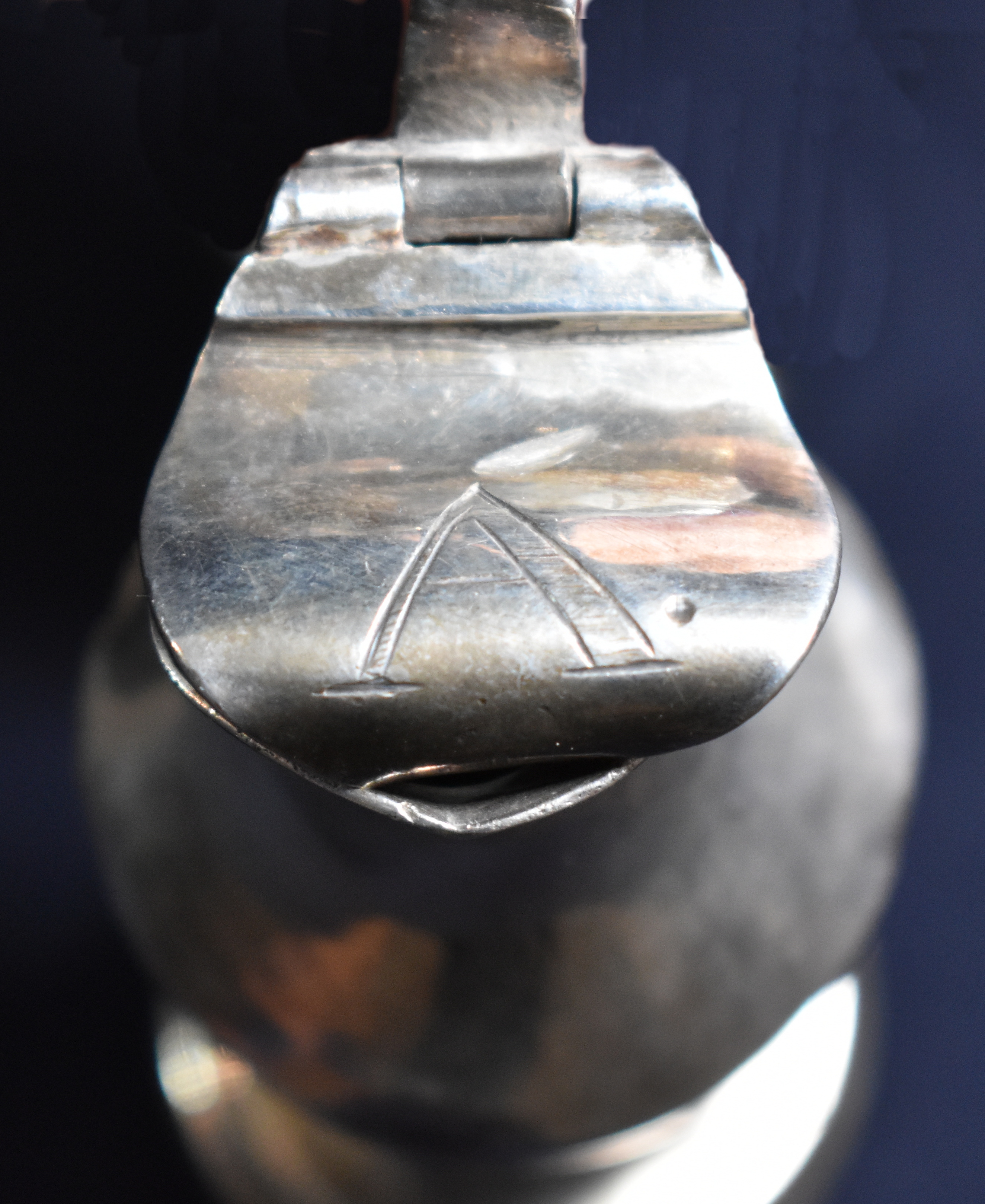 cóncavo. La boca ovalada y de trazo sinuoso se cubre con una tapadera que culmina con dos iniciales incisas "A" y "V", aludiendo al contenido de cada jarrita (Agua y Vino).