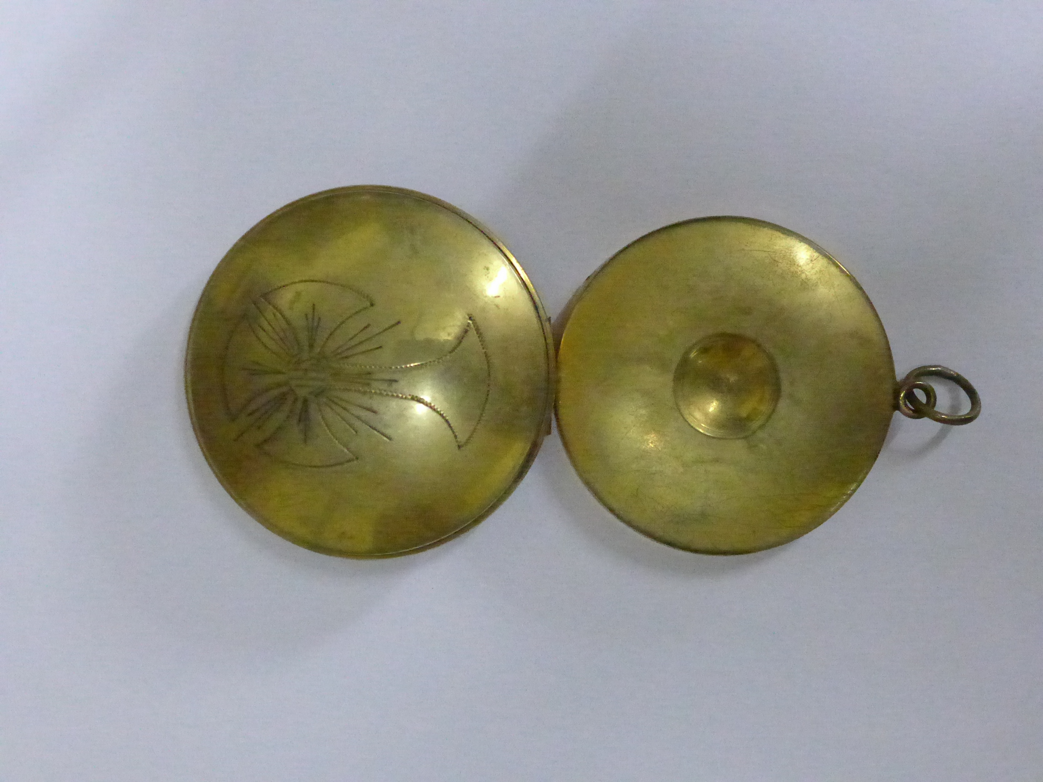 Caja circular y plana, adornada en su anverso con una cruz latina patada incisa y punteada. Exhibe el monograma IHS en el cuadrón, de donde salen fulgores. El resto carece de ornamentación. Podía llevarse colgado de una cadena por una arandela unida a un aplique que conserva.