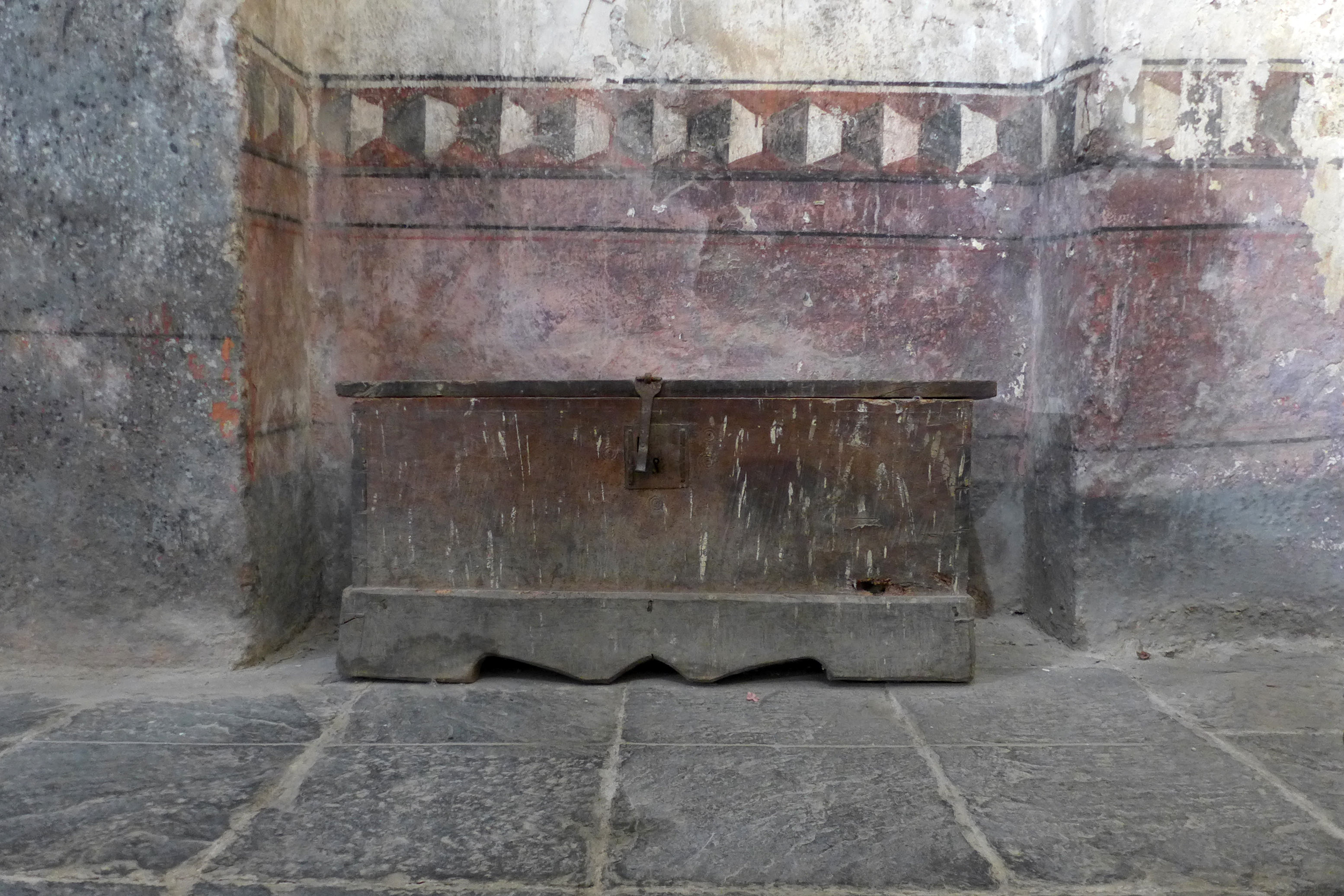 Arca de madera con tapa formada por seis tableros lisos ensamblados. Tiene una cerraja en su parte frontal superior y falleba metálica asida a la tapa. En la parte frontal superior dispone su cerradura con bocallave metálica oval en la cual se inserta la falleba metálica. Solo el ancho rodapié muestra molduras lisas.