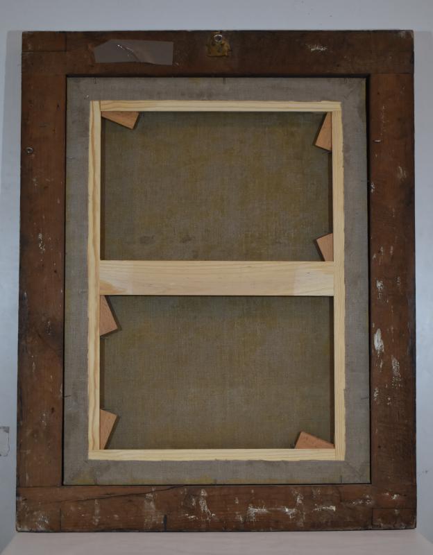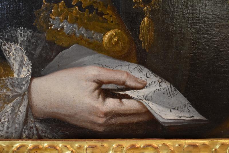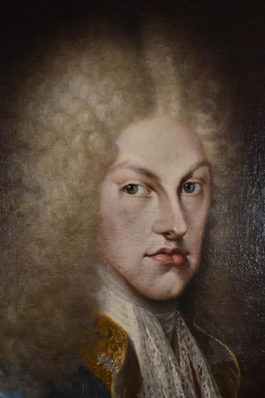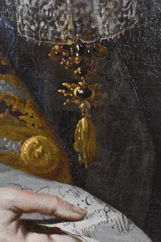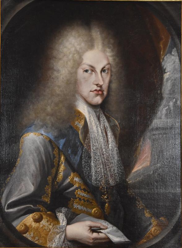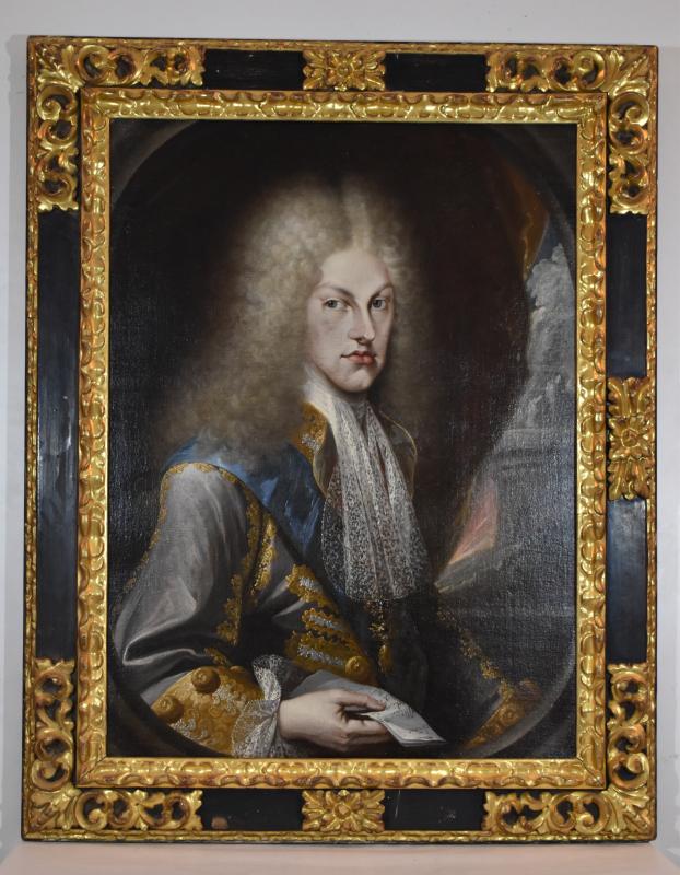 Retrato de medio cuerpo del monarca Felipe V. Se dispone en tres cuartos sobre un fondo con cortinajes y un paisaje arquitectónico. Viste a la moda de la época y porta en su mano derecha un papel con escritura. Fue donado a la basílica por el propio monarca.