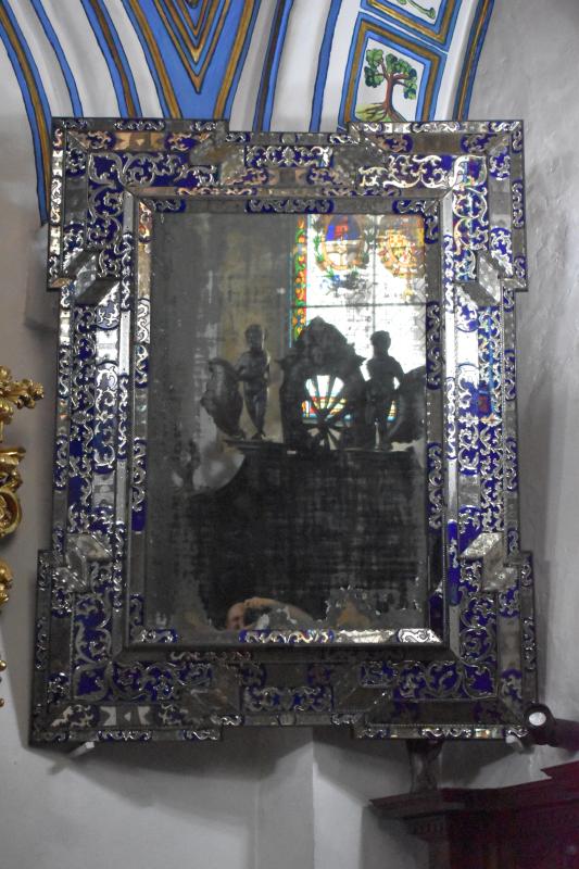 Espejo de forma rectangular con amplio marco de idéntica forma pero con expansiones u orejetas en sus esquinas. Lo más interesante del conjunto es el marco en el que se combinan el color azul de fondo sobre el que se sobreponen fragmentos de espejo recortados de múltiples formas. Donados por Felipe V a la basílica.