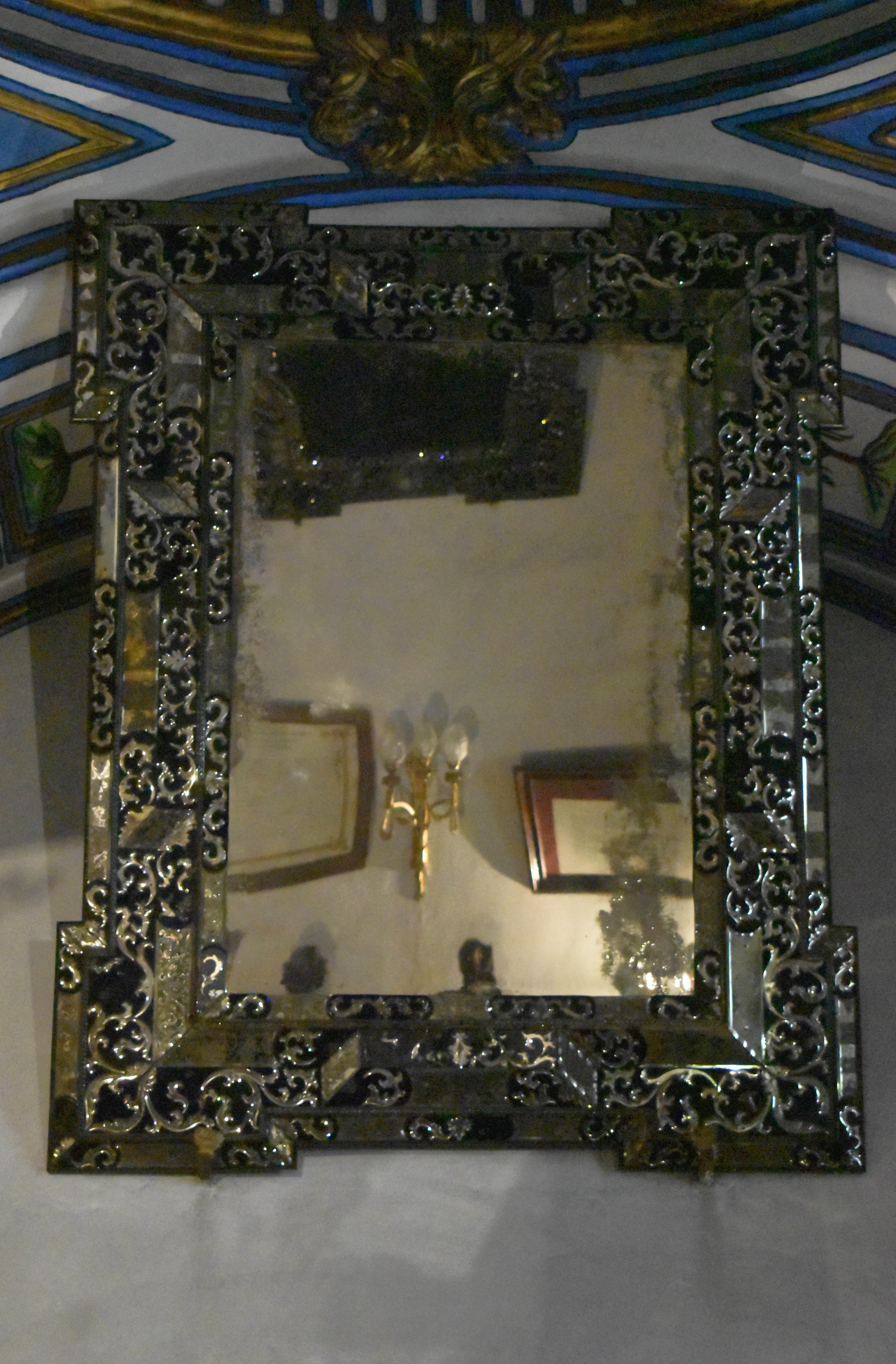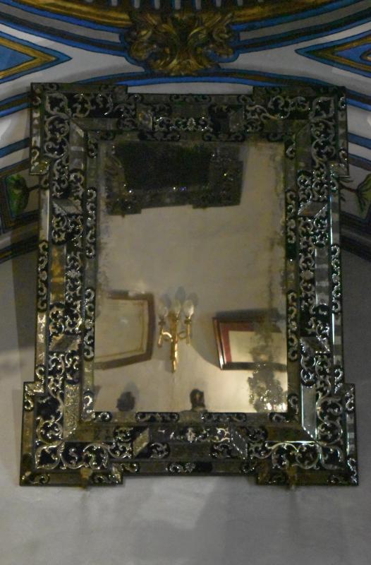 Espejo de forma rectangular con amplio marco de idéntica forma pero con expansiones u orejetas en sus esquinas. Lo más interesante del conjunto es el marco en el que se combinan el color azul de fondo sobre el que se sobreponen fragmentos de espejo recortados de múltiples formas. Donados por Felipe V a la basílica.
