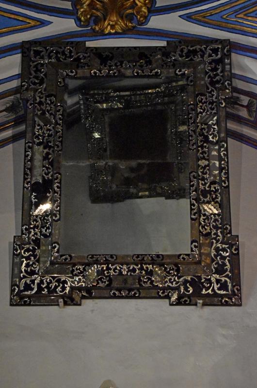 Espejo de forma rectangular con amplio marco de idéntica forma pero con expansiones u orejetas en sus esquinas. Lo más interesante del conjunto es el marco en el que se combinan el color azul de fondo sobre el que se sobreponen fragmentos de espejo recortados de múltiples formas. Donados por Felipe V a la basílica.