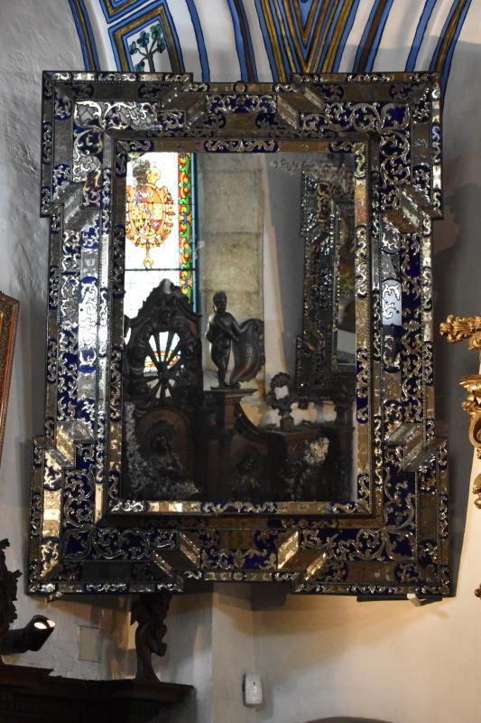 Espejo de forma rectangular con amplio marco de idéntica forma pero con expansiones u orejetas en sus esquinas. Lo más interesante del conjunto es el marco en el que se combinan el color azul de fondo sobre el que se sobreponen fragmentos de espejo recortados de múltiples formas. Donados por Felipe V a la basílica.