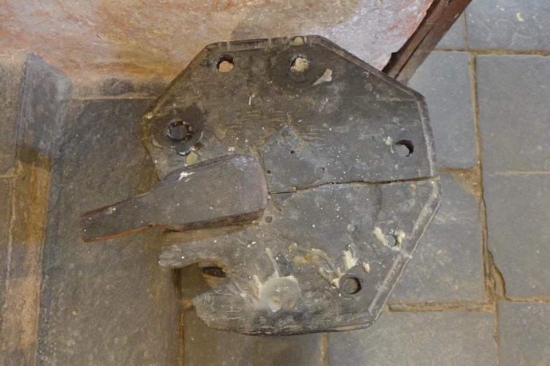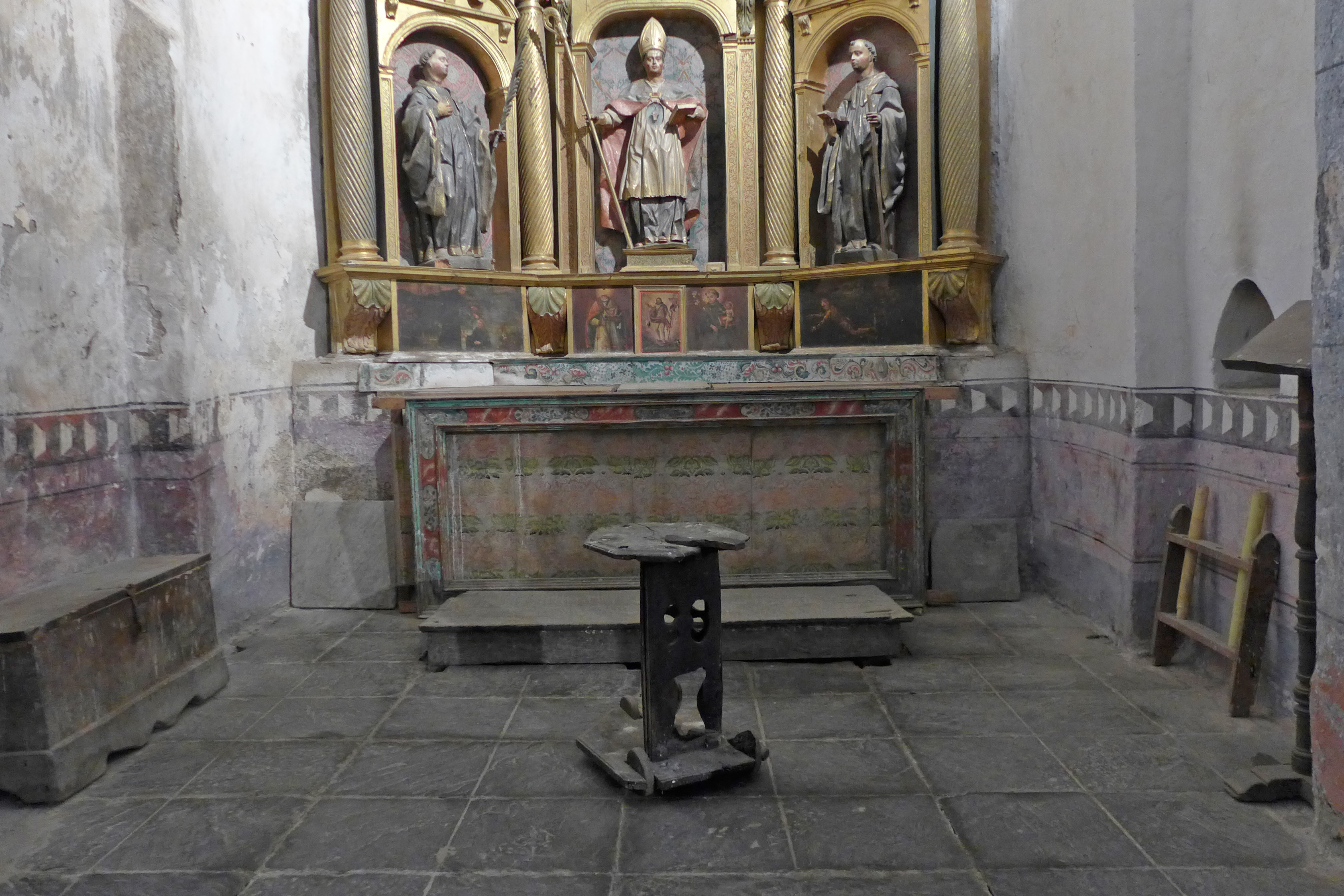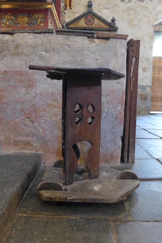 Estructura sencilla de madera compuesta de dos tableros horizontales de planta poligonal unidas por dos tablas verticales con decoración a partir de motivos perforados. Tres ruedas, también de madera, permiten mover el artilugio empujándolo con un mango de madera clavado en su parte superior. La tabla superior, de simplicísimo borde moldurado, se perfora con ocho agujeros de pequeño diámetro dispuestos para acoger velas.