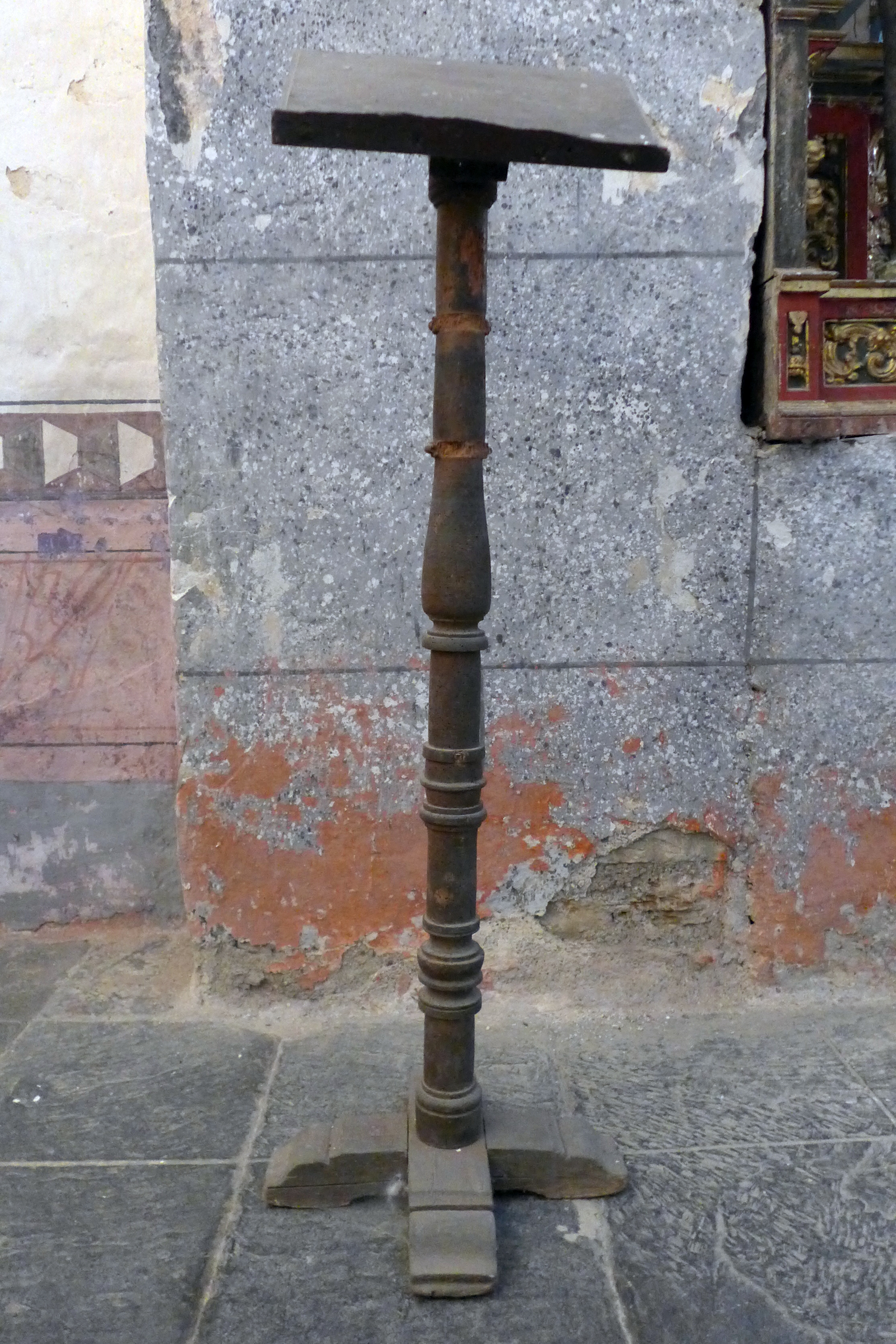 Ambón de madera compuesto de basa, pie y atril. La basa forma cuatro pies para sostener un esbelto pie torneado con diferentes secciones, que a su vez sostiene una tabla inclinada con una pequeña basa para sostener el libro que habría de acoger.