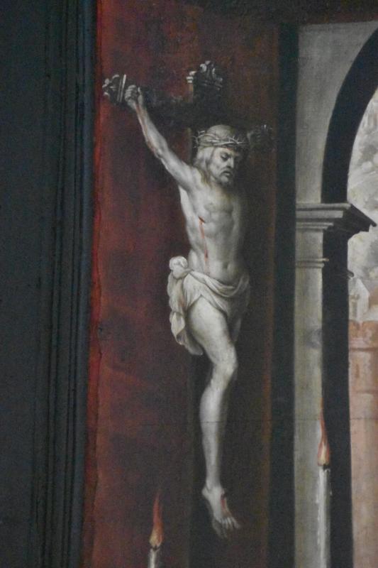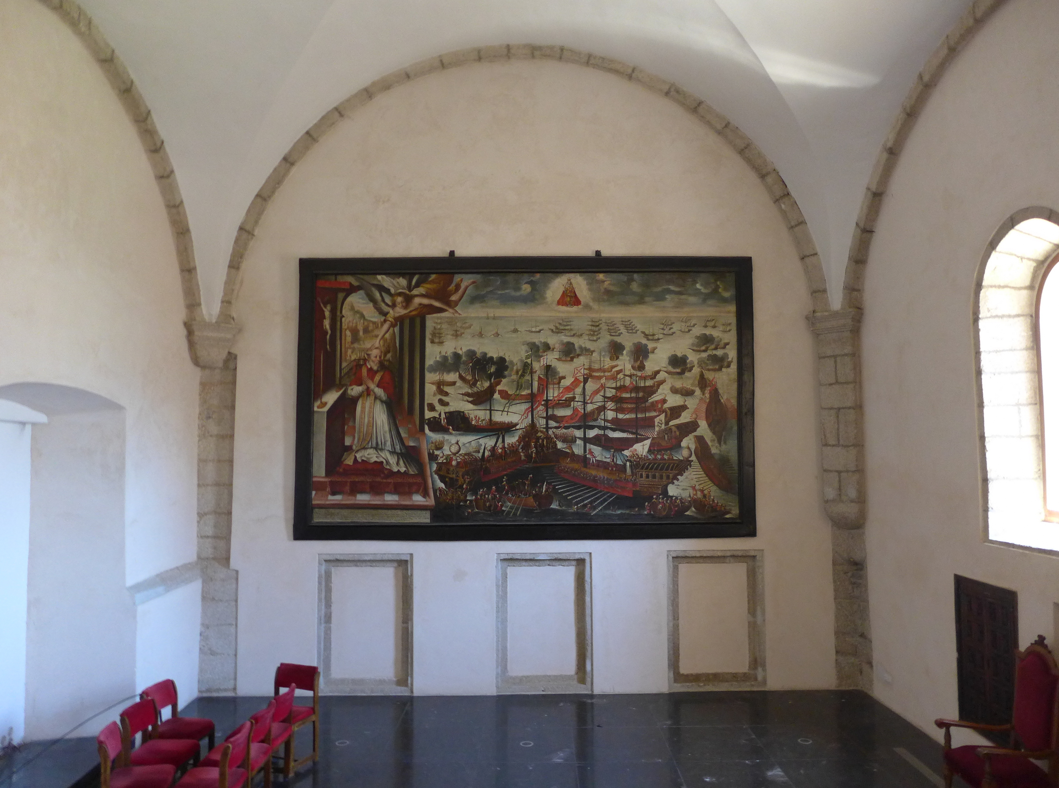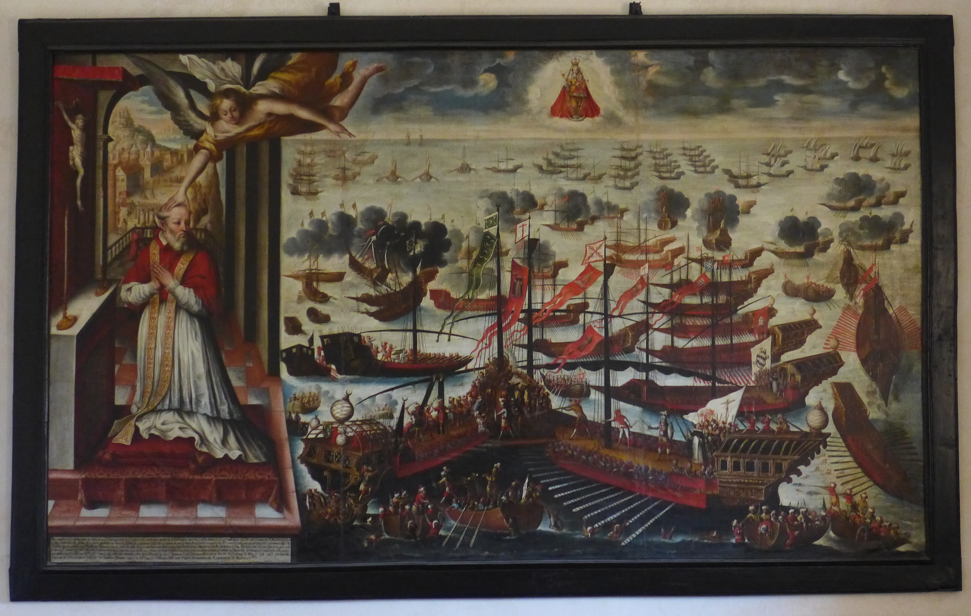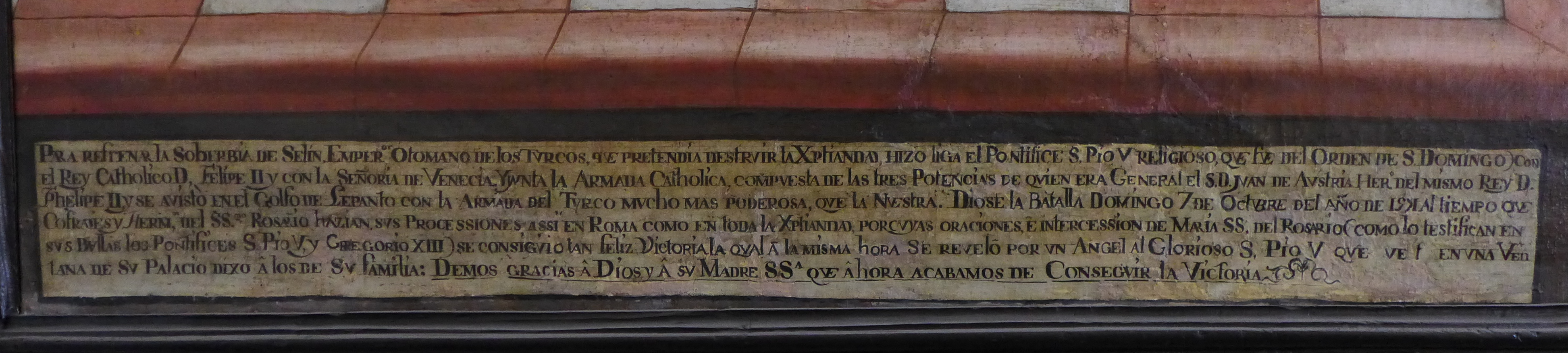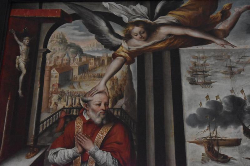 Cuadro de la Batalla de Lepanto (1571). A la derecha se ve la batalla entre la armada cristiana y la turca recogida con todo detalle (tipo de naves, técnicas de abordaje, banderines con iconografía...), a la izquierda Pio V rezando delante de un crucifijo un ángel le toca la cabeza y le anuncia la victoria. Tras él, en un fondo visible a través de la ventana se ven las procesiones que se hacían en la ciudad. En el cielo aparición de la Virgen del Rosario, cuya imagen domina toda la composición. Bajo el pontífice una larga inscripción que narra el contenido del lienzo.