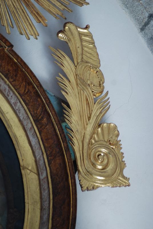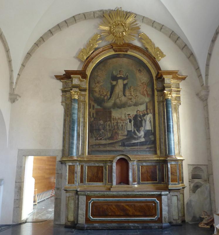 Retablo de factura neoclásica compuesto de basamento con mesa de altar, banco y un único cuerpo con coronación ornamental. Las dos primeras estructuras son sumamente sencillas, reducidas a elementos funcionales y carentes de decoración más allá de recuadros y algún motivos geométrico. Ambas partes se jaspearon en tonos grises y marrones para imitar mármoles y otras piedras. En el centro del banco se abrió una pequeña hornacina en arco de medio punto en la que debió de ir una pequeña cruz de altar, aunque hoy permanece vacía. Por lo que respecta al cuerpo del retablo va flanqueado por pilastras cajeadas y dos columnas de capitel compuesto. Esta superposición de elementos sustentantes aporta un cierto dinamismo, también presente en el banco, al sobresalir los netos y la hornacina y remeterse el resto. En el centro de cuerpo un gran lienzo de remate semicircular que obliga al retablo adaptar a esa forma su cierre. Por último, sobre el conjunto sendos adornos fitomorfos y un resplandor celestial en el centro.
