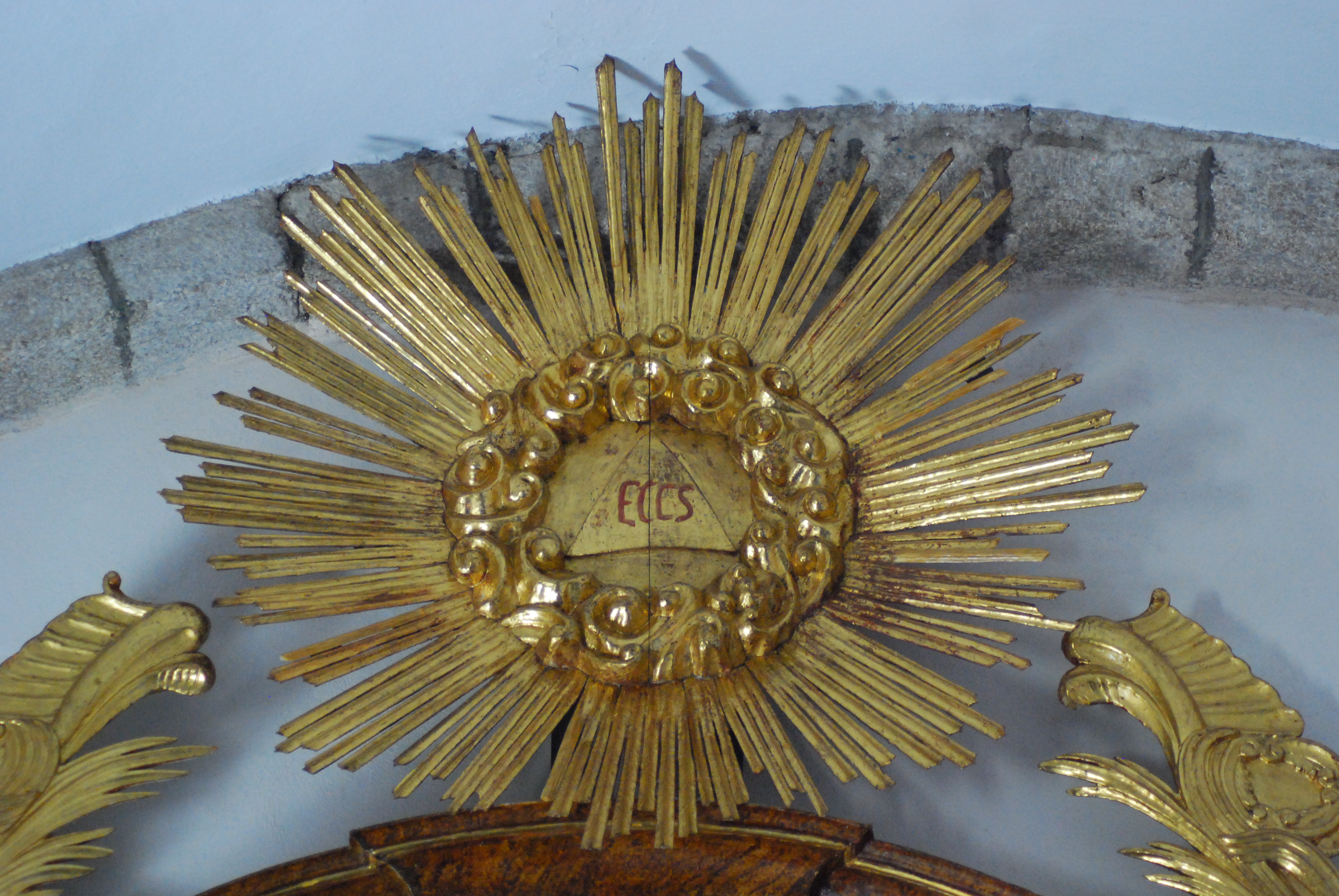 Guirnalda de flores circular envuelta en un resplandor de finas potencias. En el círculo central se talló un triángulo en relieve y se añadió una inscripción en letras rojas: ECCS (quizá abreviado ECCLESIA).