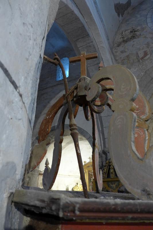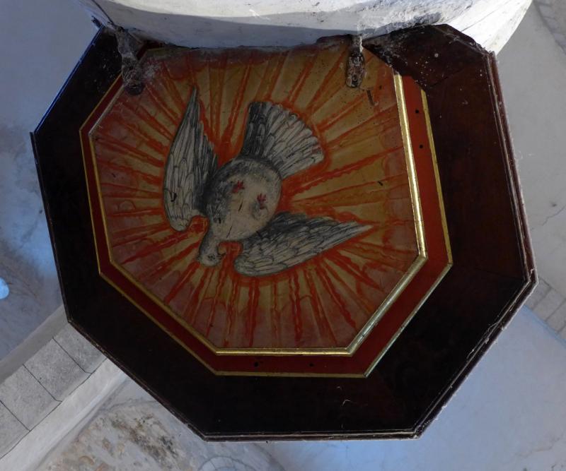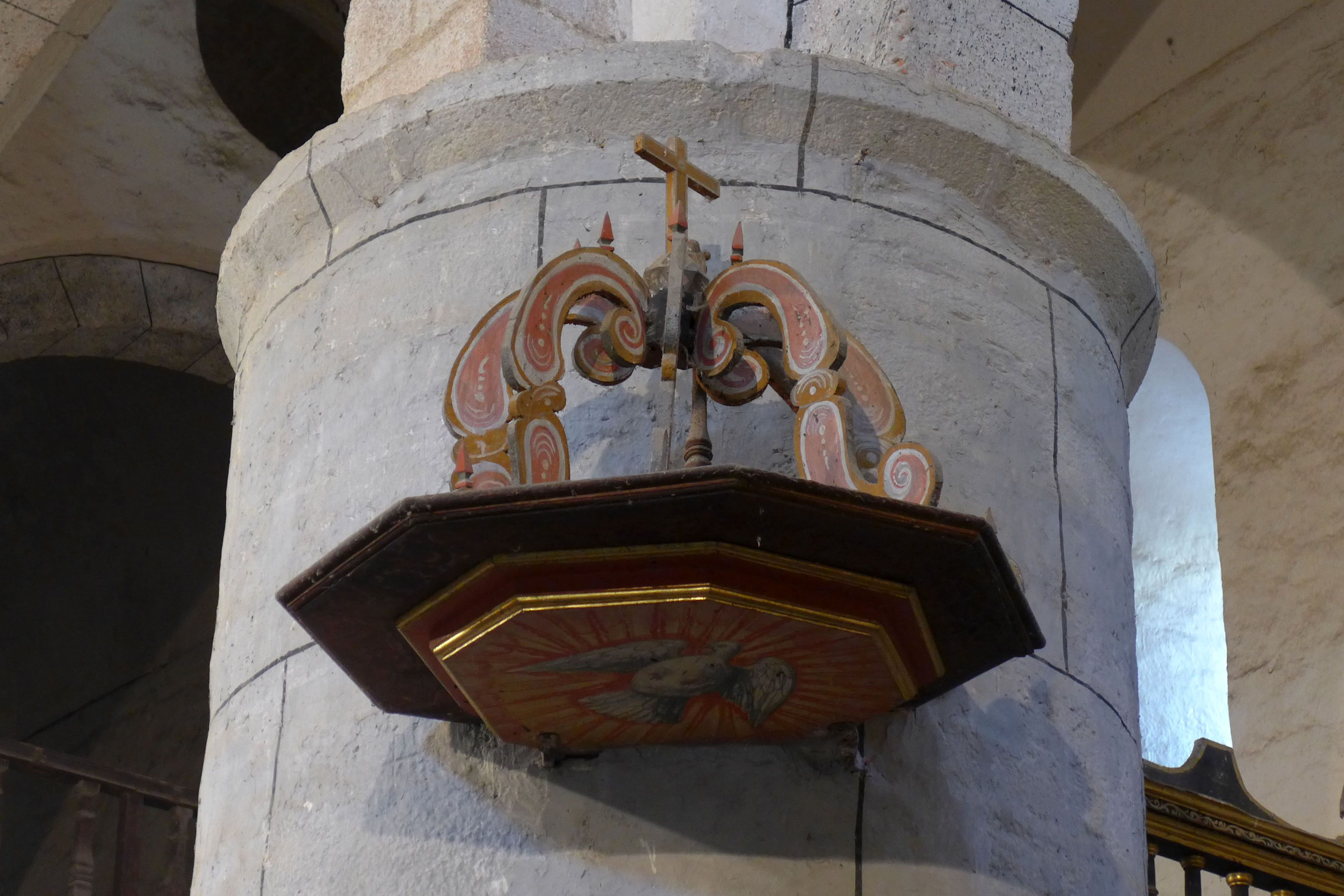 De planta octogonal y encastrado en el pilar, la cubierta se remata con unos mensulones avolutados en forma de S de madera, en cuyo centro se eleva una cruz. El techo del tornavoz muestra, sobre un octógono moldurado, una pintura con la parte inferior de una paloma que desciende entre rayos solares.