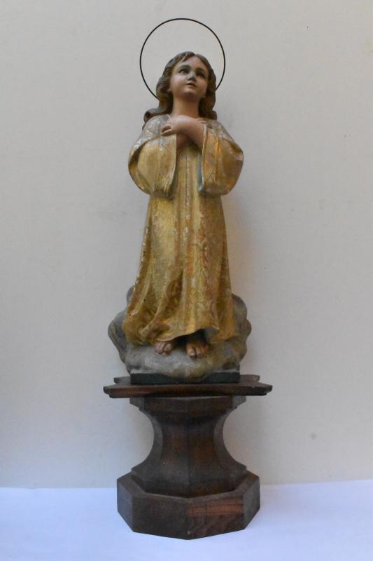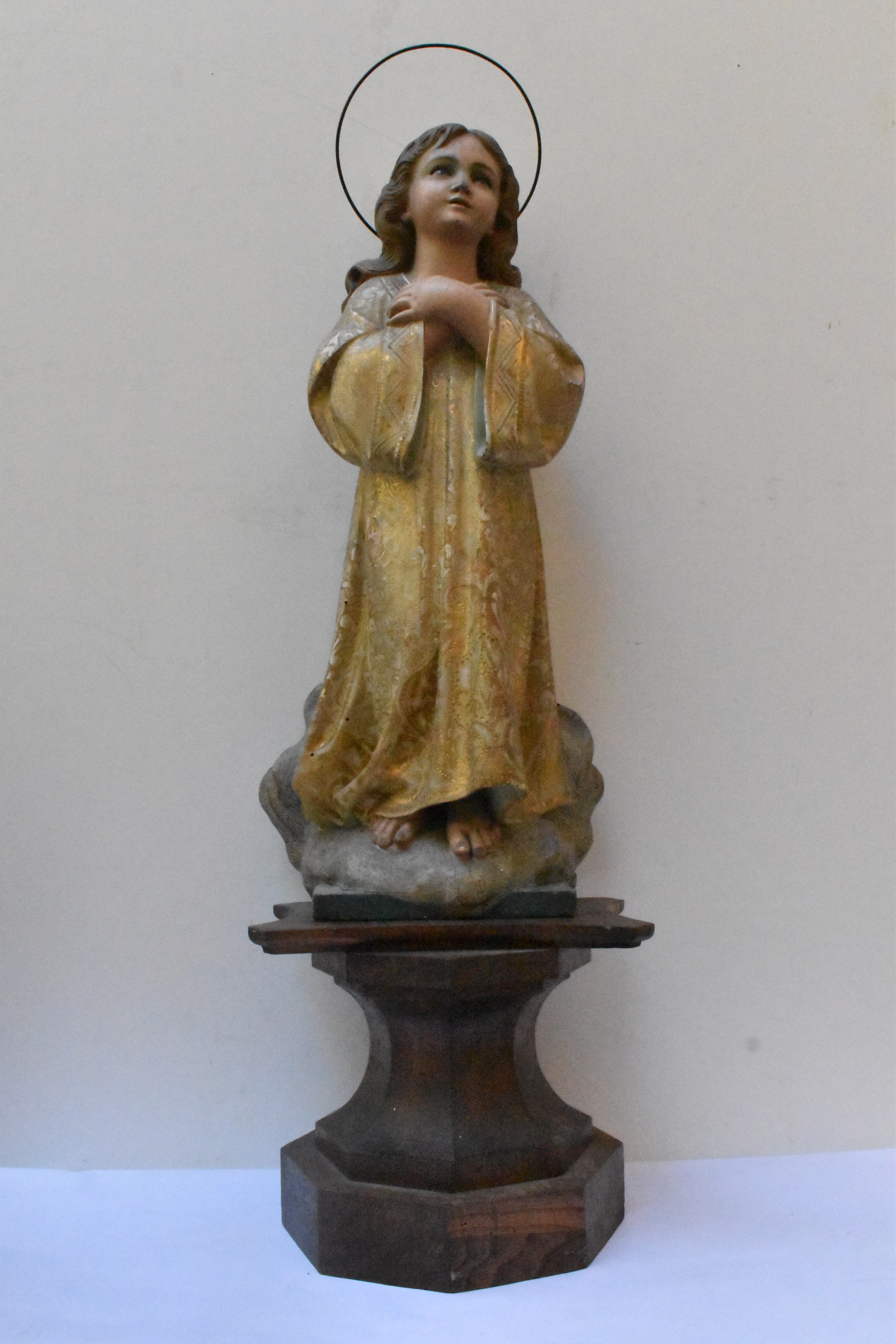 Virgen niña de pie sobre subaje alzado por alta peana. La Niña mira arrobada al cielo con las manos unidas a la altura del pecho. Viste manto amarillo. Posee un aro metálico como nimbo